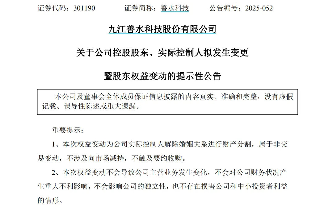 11月7日,善水科技发布公告称,公司实际控制人黄国荣和吴新艳解除婚姻关系,并进行财产分割,公司实控人变更为吴新艳。若按照善水科技11月7日的收盘价格计算,吴新艳新增持有的3790万股公司股票,市值达9.24亿元。(现代快报)