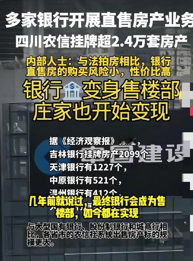 一觉醒来,房产中介集体懵圈!不是市场不让卖房,而是银行亲自下场抢生意了! 四川农信一口气挂牌2.4万多套房产,广东、辽宁农信的挂牌量也都破万,吉林、天津等多家银行也跟着加入售房大军。别以为银行是新设了售房部门,这些房其实都是抵债资产,借款人还不上贷,银行处置后直接对外出售。 有人说和麻烦不断的法拍房比,银行直售房简直是香饽饽——产权清晰无纠纷,价格还比市场价低30%以上,风控早就把腾房、产权这些坑过滤干净了。这背后其实是银行在优化不良资产处置,既能提高回收率,也给购房者多了个靠谱渠道。 大家对此怎么看,靠谱吗? 银行直售房产与法拍房有何区别 银行批量直售房产