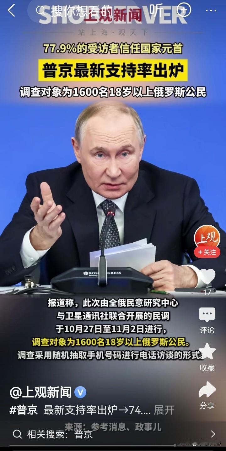 77.9%的支持率,还是很高的,普京应该还是可以接受吧。 虽然相对于去年还是半年前80%多的支持率有所下降,77.9%放眼世界,也还是很高的。 当然,当年神曲《嫁人就嫁给普京这样的人》在俄罗斯流行的时候,普京的支持率肯定要更高一些。但是,那时候是2002年吧,是他刚在世纪之交临危受命,做得还不错,俄罗斯人对他的工作都还挺满意的。 那时候,他也就刚满50啊,2002年。 到现在,也70多岁了,能带领俄罗斯对抗以美国为首的西方国家,屹立不倒,这就很难得了。 前些天,“海燕”核动力巡航导弹,以及“波塞冬”无人潜航器(核鱼雷)的成功,又可以给俄罗斯几十年的战略安全。 普京处处以俄罗斯利益为重,虽然有“假如俄罗斯都没有了,还要地球做什么”这样的狠话,但还是以此获得了俄罗斯人的支持吧!