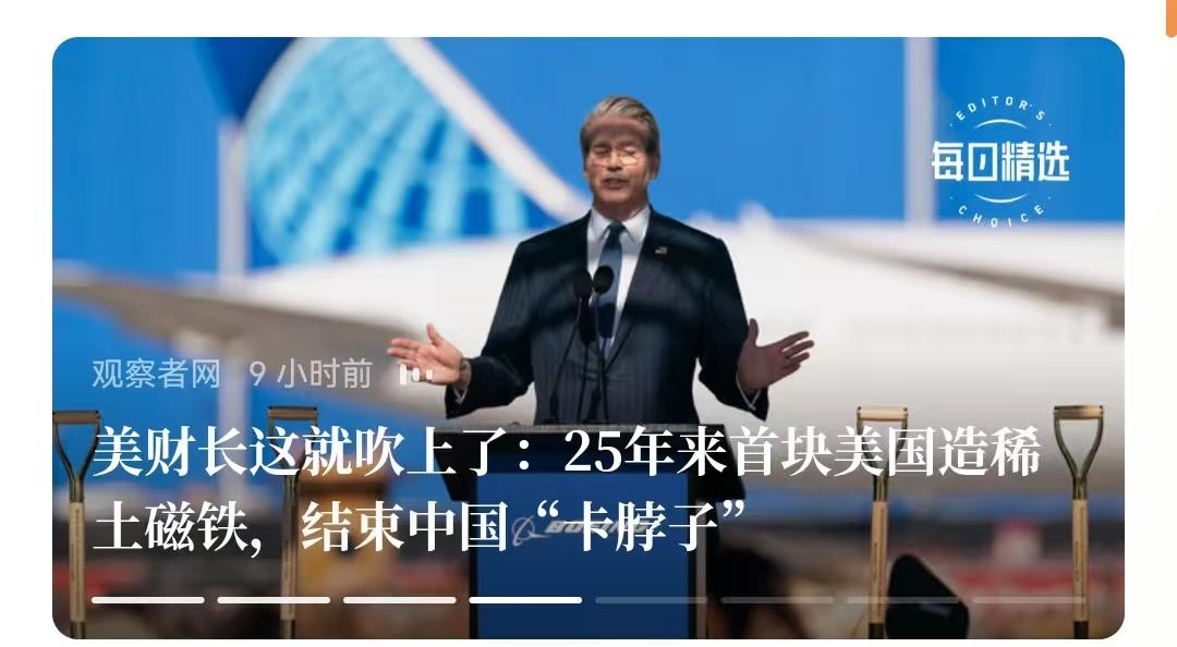 美财长这样吹的:25年来首块美国造稀土磁铁,结束中国"卡脖子。 这样说,不是真的做到了,也不是美国“有志气”,而是美国造势,意思是“看,我也有了,自己做的,中国,赶紧不要设限了”。 我们看的很明白,这点小心眼,只能是属于小把戏,不然美国会立即翻脸,这是想诓我们放弃管控。 所以,我们该怎么控制就怎么控制,至于美国的“自造”,至少还要百年。