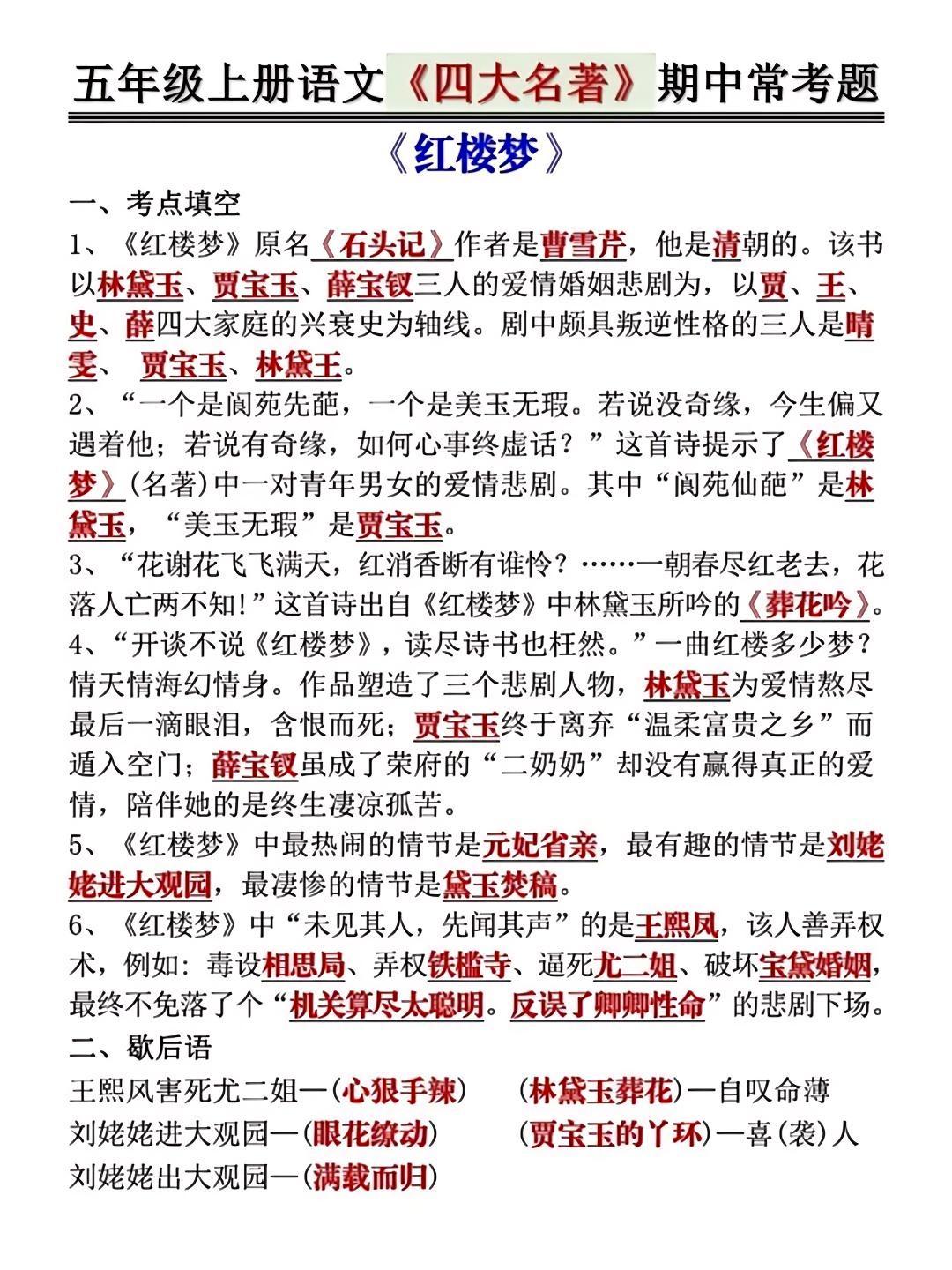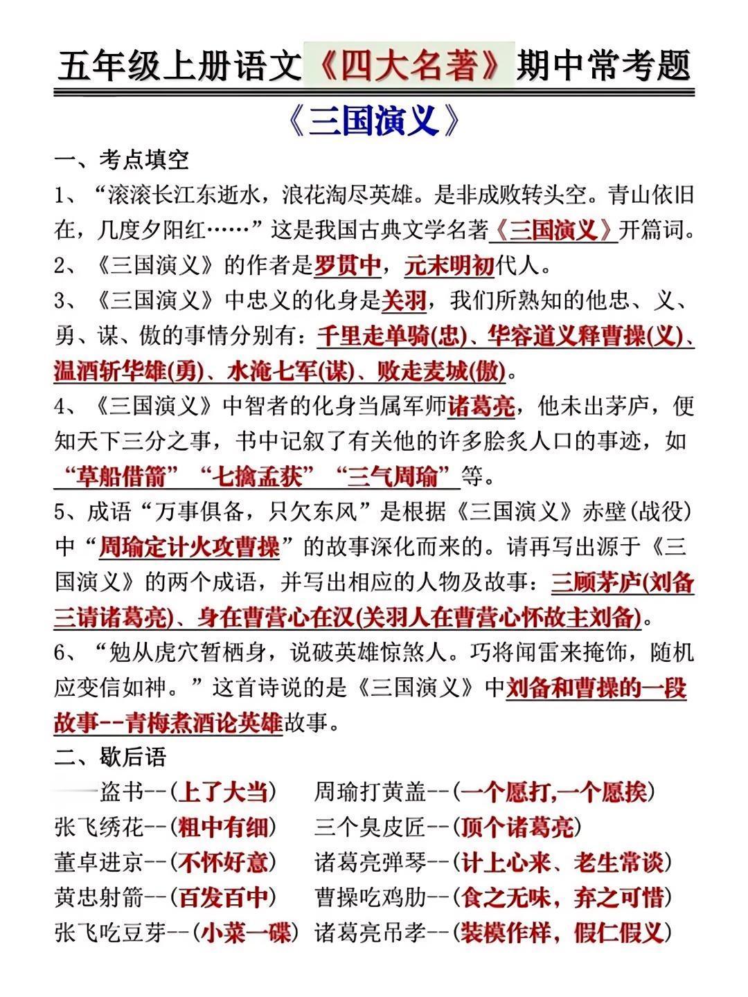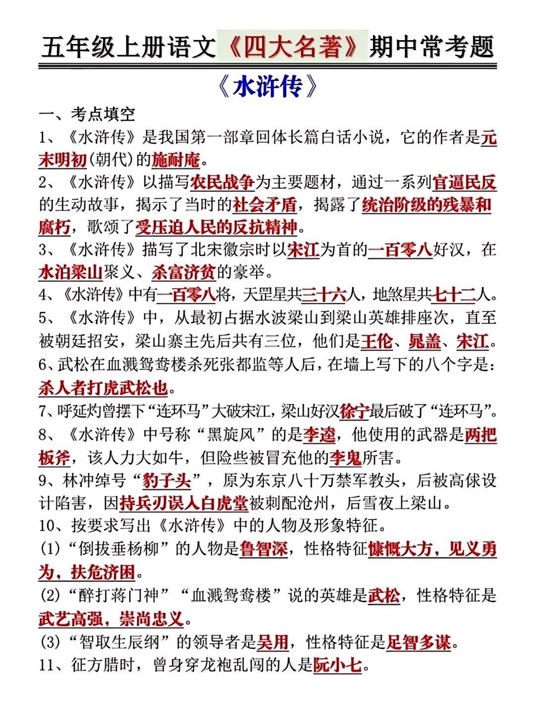 五年级上册语文《四大名著》期中常考题,是孩子查漏补缺的好帮手,抓紧时间收藏起来吧!