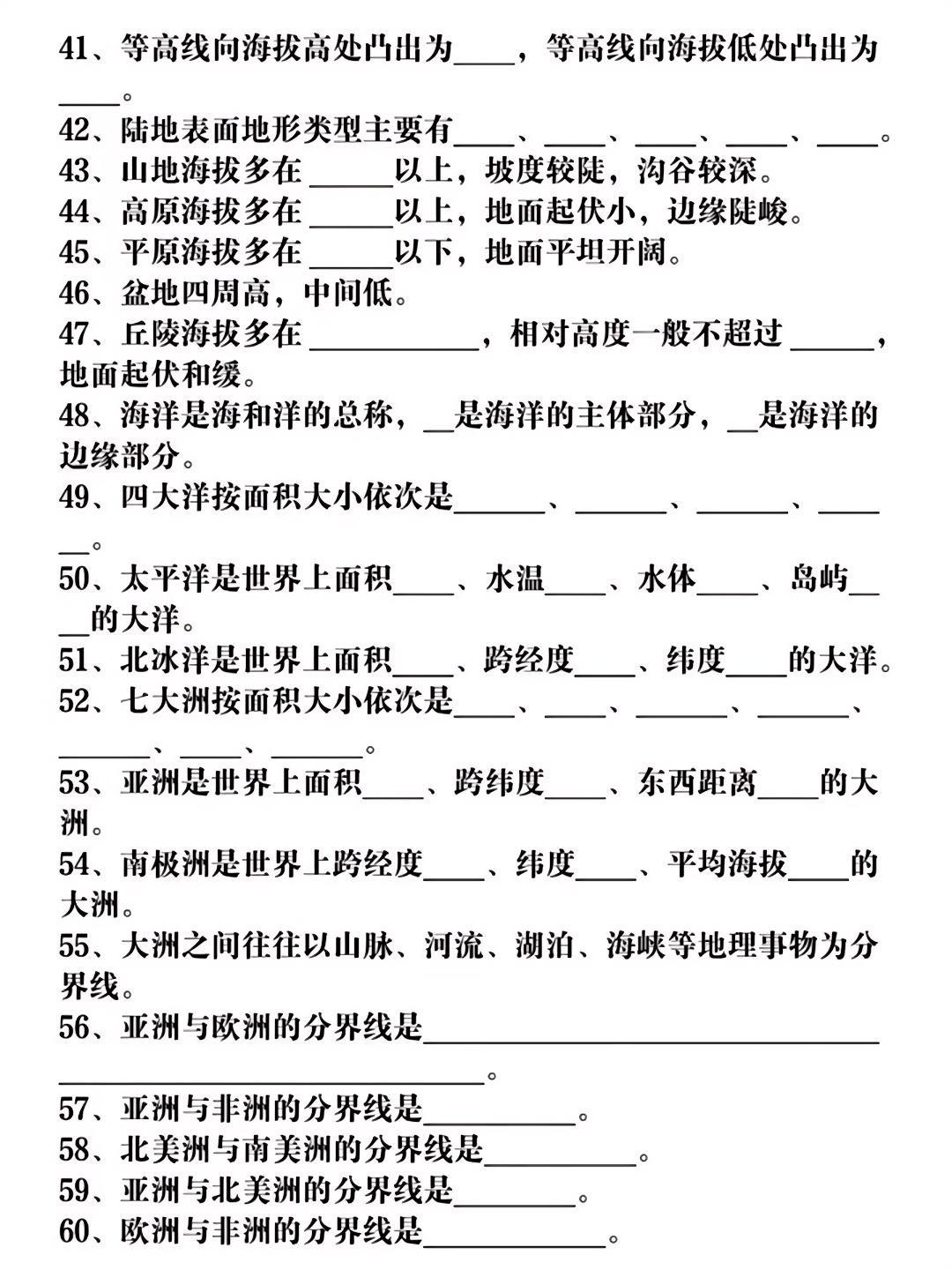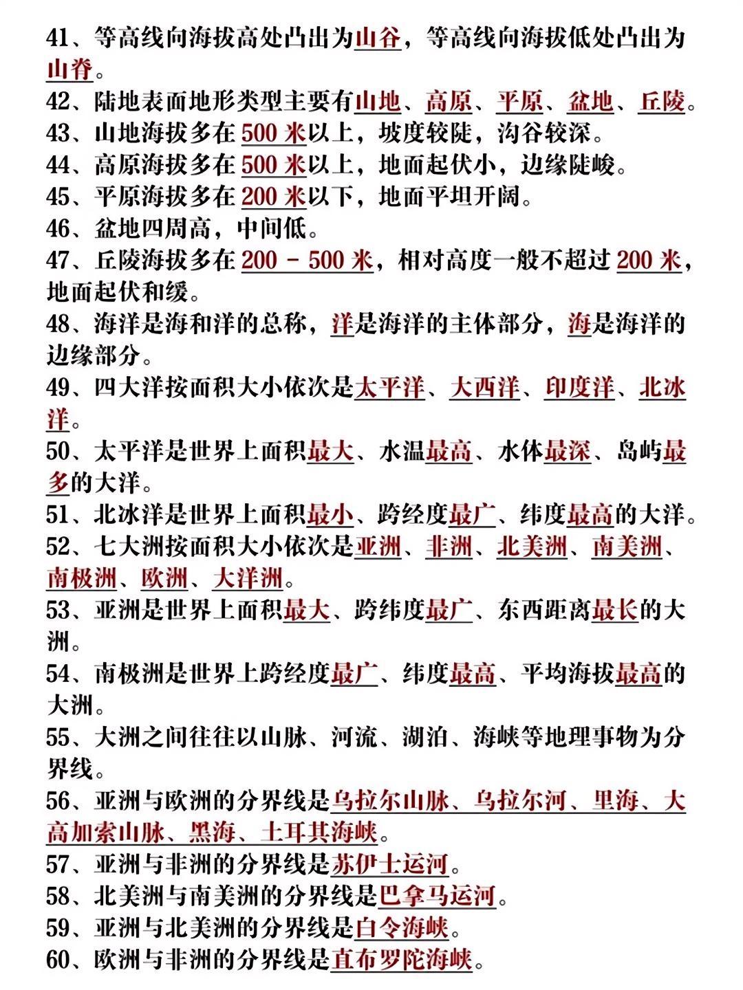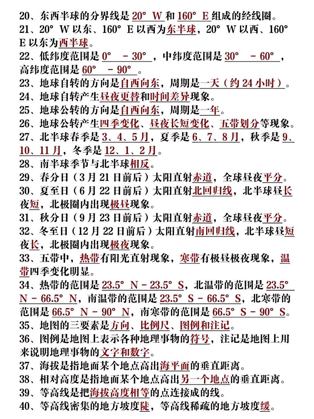 七年级地理上册期中必背高频考点50个!