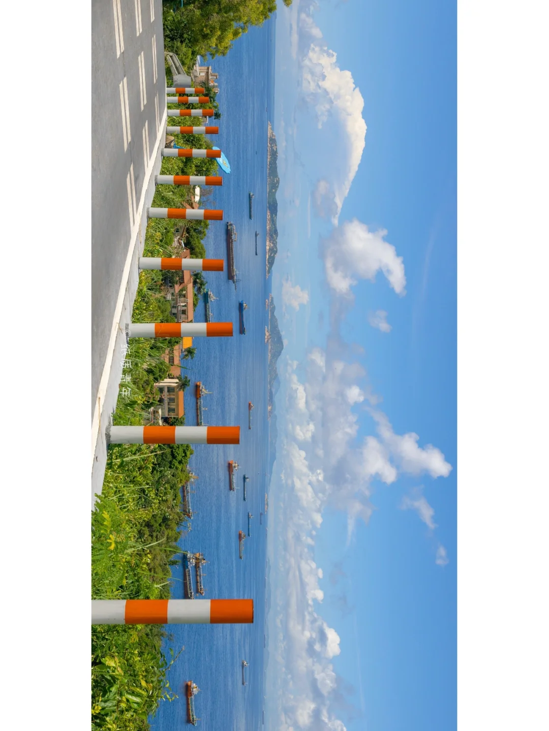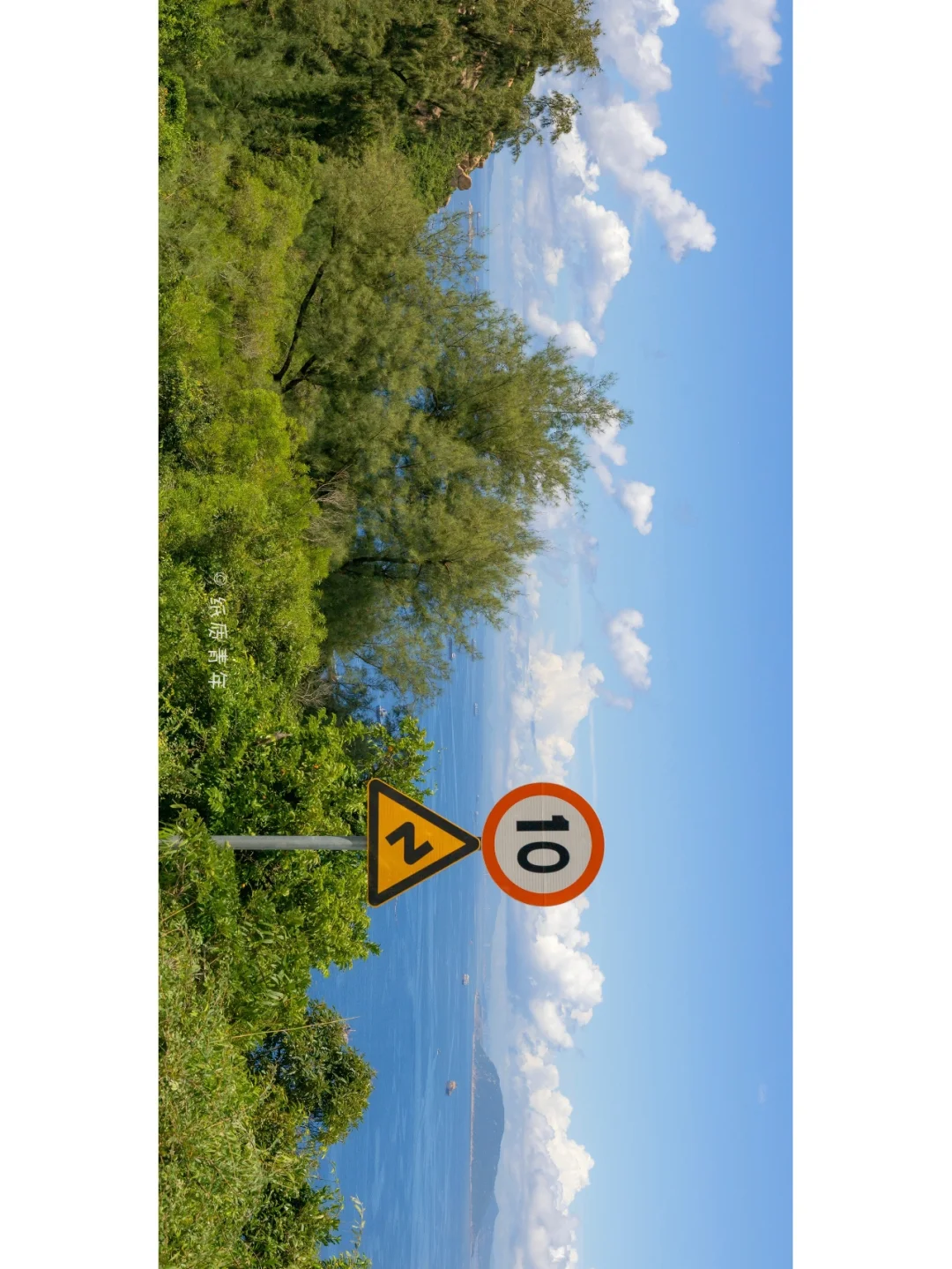1️⃣沿路从前山到山顶大概50分钟左右,从三岔路口到半山腰开始视野逐渐开阔,马路旁边红白相间的护栏非常出片🚧,拍日系风格再合适不过了。(图四)