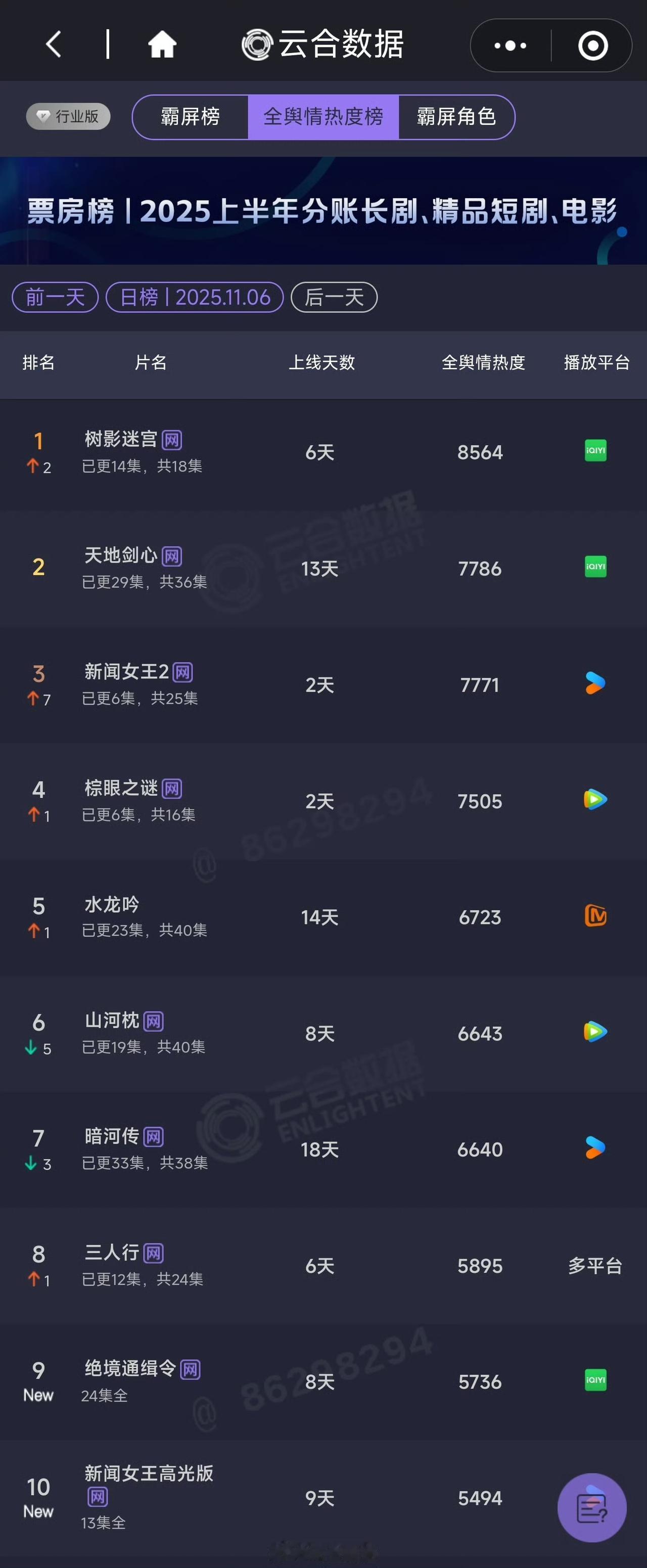 桃最近要逆天呀‼️ 预测明天全网数据排前三的全是桃🍑🫣 第一《天地剑心》 第二《唐朝诡事录之长安》 第三《树影迷宫》 最近上的新剧,部部品质高,剧情好,数据连着霸榜✅严重怀疑换领导层了🤣 《一笑随歌》打头阵👍 《沉默的荣耀》网台联播,数据口碑可圈可点🫡《天地剑心》连续霸榜👏 《树影迷宫》云合舆情热度直接干到了第一☝️,有效播放秒杀《暗河传》、《水龙吟》排第二👍 刚上的《唐诡》首日直接杀到平台第一,相信吗⁉️全网数据可以预测明天排前三的估计全是桃🍑🫣 恭喜桃在第四季度打了一个漂亮的翻身仗✅👍