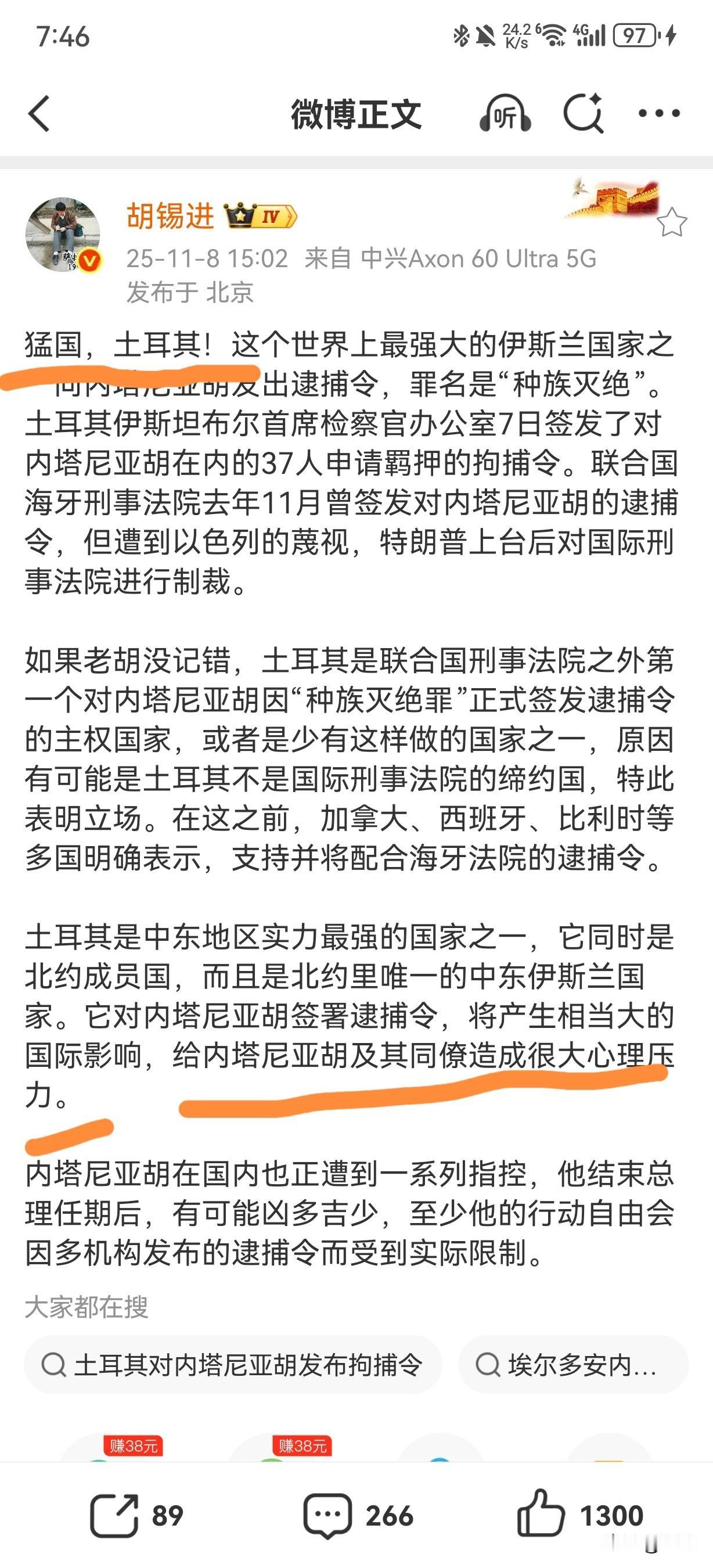 猛国还是“宣传噱头"?土耳其11月7日宣布对以色列37名政府高官发出逮捕令,包括内塔尼亚胡,指控他们涉嫌在加沙地区有系统地犯下种族灭绝与反人类罪行。 面对逮捕令,以色列外长萨尔斥之为"宣传噱头",坚决反对这一指控。 老胡则在微博中称土耳其为猛国,此举给内塔尼亚胡及其同僚造成很大心理压力。事实上,由于缺乏跨境执行的强制力,这份逮捕令的象征意义确实大于实际效力,短期内难以对以方高官形成直接约束。但它的核心价值在于,再次将以色列的军事行动置于国际正义的审视之下,加剧了其国际孤立态势。 对此,大家怎么看?