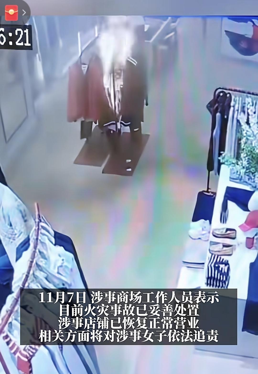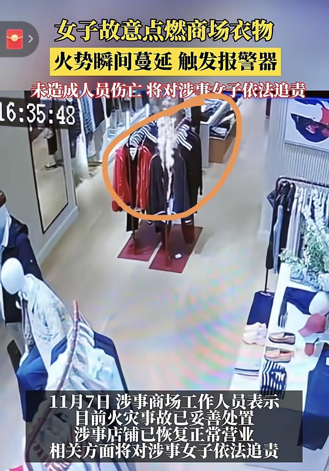 重庆妹子商场故意点燃店铺衣服,据说知心大姐姐会出面保她—玉玉症+认错态度良好,大概率会和解! 从监控画面来看,女子提着袋子一个桶,进店在货架上徘徊,店员以为是客人自己在看衣服就没上前跟着,也不知道是不是对服务不满,还是单单那件衣服刺激到了她,镇定自如的点起了火,我是真的佩服 ,她不知道现在商场都有监控吗? 点完衣服就走,走的那么干脆,她没考虑过万一大火烧起来会造成什么可怕后果么? 商场方说该女生要为自己情绪方面负责,果然小仙女就是这么任性,出事了就是玉玉症帮忙脱罪 但这次我认为哈再怎么说都不可能保得住,涉事女子涉嫌故意纵火罪,危害公共安全罪,事儿可老大了,如果没有及时发现就会变成群体事件,还好店员反应及时,灭了火! 从监控画面时间来看,衣服被点燃后一分来钟直接烧成渣,店内浓烟滚滚,隔着监控都怕被呛到 记者问“为什么烧的那么快,一下子就点着了”? 店员说“衣服是纯棉的,所以快” 网友对衣服材质起了兴趣,议论纷纷 有人说“全是棉的?哪来的棉,全聚酯纤维,塑料的,一点火烧的很快” 也有这家店的熟客说“这个牌子确实有蛮多棉的,至少这条货架上是有蛮多” 这个牌子价格还不便宜,估计得赔不少 如果是棉的多,那确实价格要贵些 这女子要能赔,估计要赔不少 但要是带“精神”两字,没能力赔,商场店铺估计也束手无措,尤其是人家还有知心姐姐帮忙,商家赢面太小了 也有不少人问,到底是聚酯纤维烧的快还是还是纯棉快?有知道的吗?