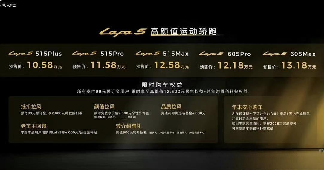 高颜值轿跑,零跑lafa5.预售价格出来了: 有两个续航版本: 515km和605km,而且还承诺购置税补贴。 这车肯定好开,一是车小,二是欧洲团队调教,对于小车来说,好开就是最大的优势。 这个价格你满意吗。 【来自懂车帝车友圈】