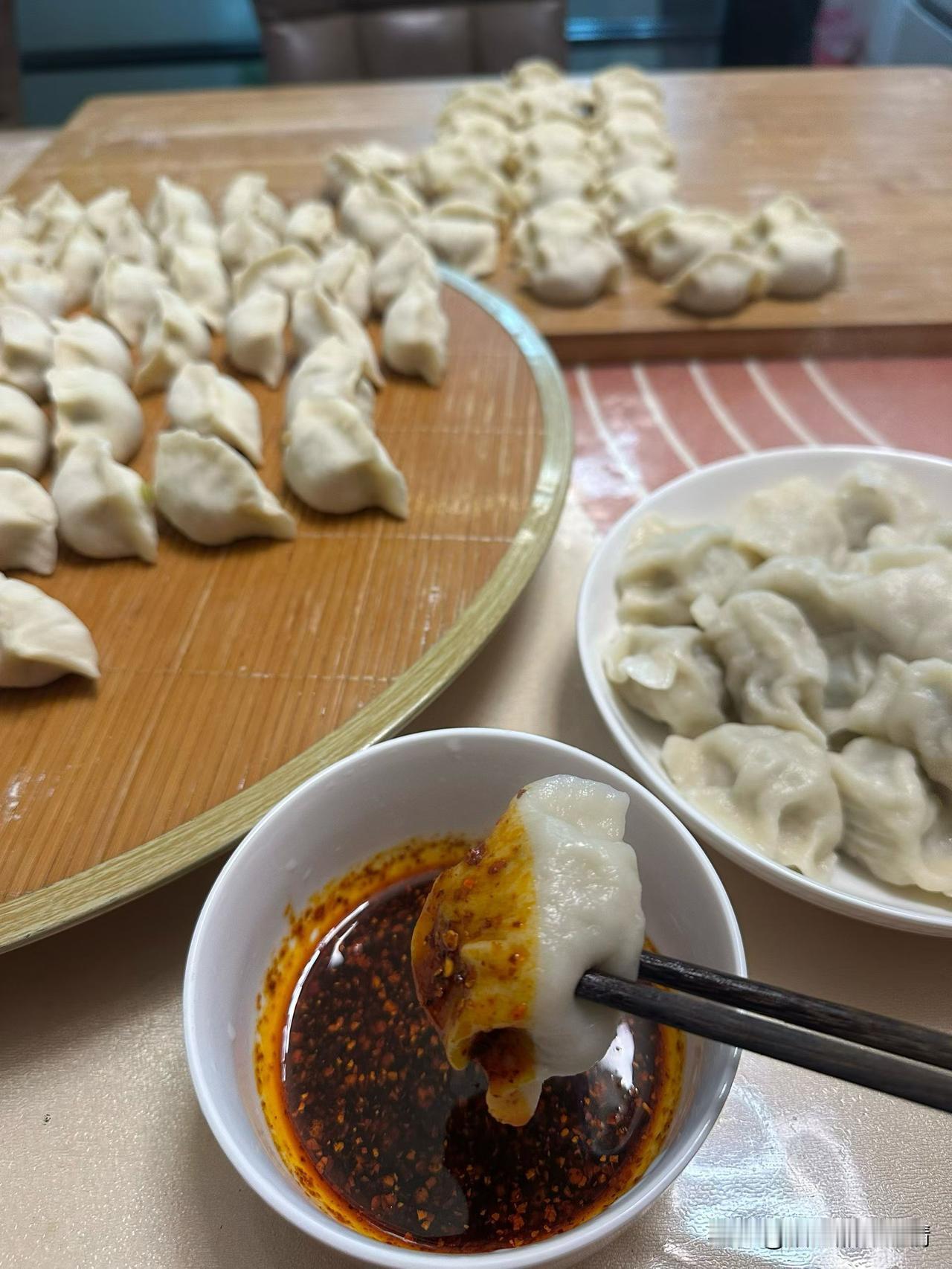 中午一进门就闻着香味了!我妈搁那儿哐哐包饺子呢,案板、盖帘上堆得满满当当,圆滚滚一个个特可爱~ 刚煮好那盘还冒着热气,我直接夹一个裹满红油辣子——咬开那瞬间鲜汁儿裹着馅儿就飙出来,香得我眯眼! 我妈说这是白菜猪肉馅儿,调了点虾皮提鲜,难怪越吃越上瘾。现在盖帘上那堆还等着晚上接着煮,这幸福感直接给我焊在饭桌上了!
