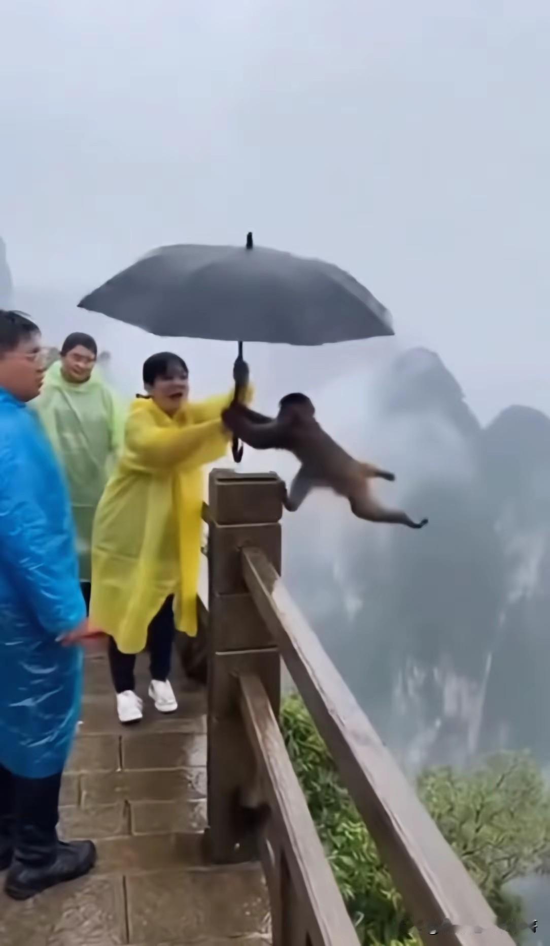 峨眉山的猴子非常讨厌,大家如果去过峨眉山的话,都知道那里的猴子不仅会撩妹,还会袭胸,还会偷你的东西,但是没有想到这一次猴哥失算了,他看到一个游客打着雨伞以为是什么好吃的东西,然后就去抢,结果的话抢过来之后的话,一阵山风起来,就直接连猴带伞吹飞起来了,然后的话就直接飞到山涧里边了,这猴哥是真的要腾云驾雾了,游客也一脸无奈,但是我估计这猴儿也摔的不轻,谁知道挂到哪里去了,真的是远离家乡了,远离故土!