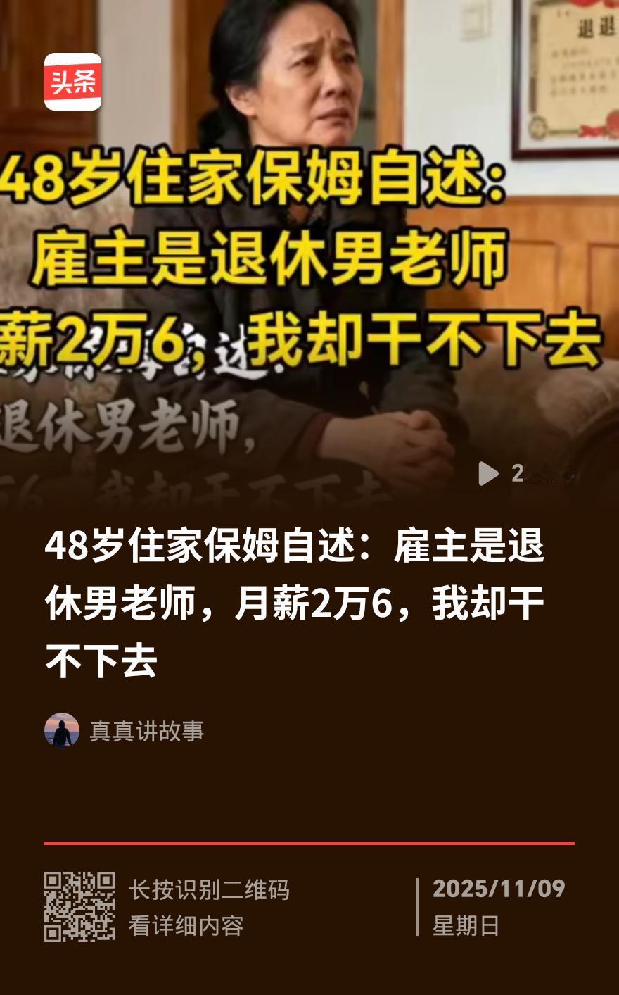 月薪2万6住家保姆辞职!退休男老师的要求,给3万也不干! 48岁保姆苏惠芳撞上“高薪好运”,住家伺候退休男老师,月薪2万6,本以为是天降福音,没料俩月后坚决辞职,哪怕雇主加价到3万也不为所动。 这份工作起初让苏惠芳喜出望外。做保姆五年,她最高月薪才1万5,还是伺候中风老人的苦差事。雇主宋老师温和有礼,家里书香四溢,给她安排带独立卫生间的房间,起初相处像春风拂面。 可温馨日子没过多久,宋老师的要求变得离谱。先是让她换深色衣服、弃穿牛仔裤,接着直接送“工作服”,白色衬衫、深蓝色连衣裙,全是按已故老伴的喜好准备。更过分的是,要求她梳老伴的低马尾,说话柔若细语,走路小步轻挪,活脱脱把她当成了“替身”。 宋老师禁止她工作时玩手机,每晚逼她聊文学历史,哪怕她一窍不通。整理书房时,苏惠芳发现其老伴日记,才惊觉所有要求都在复刻逝者。最后宋老师竟提出,每晚七点到九点让她穿老伴衣服、坐老伴位置、模仿老伴语气聊天,甚至握她的手教弹老伴爱听的曲子。 这些要求像枷锁困住苏惠芳,她再难忍受,果断辞职。高薪虽诱人,却不能丢掉自我。你遇到过类似奇葩雇主吗?评论区聊聊你的经历~家庭住家保姆 家庭住家保姆 保姆行业