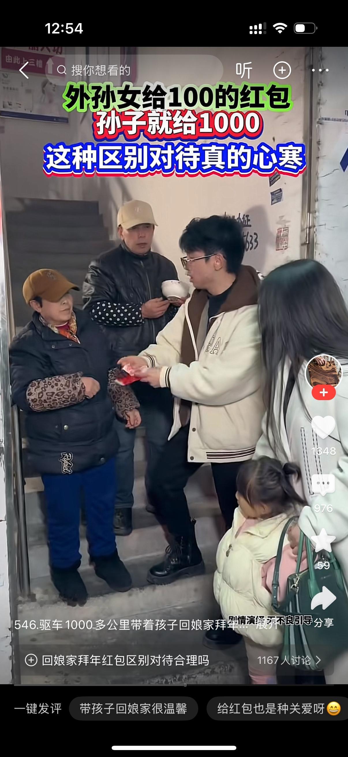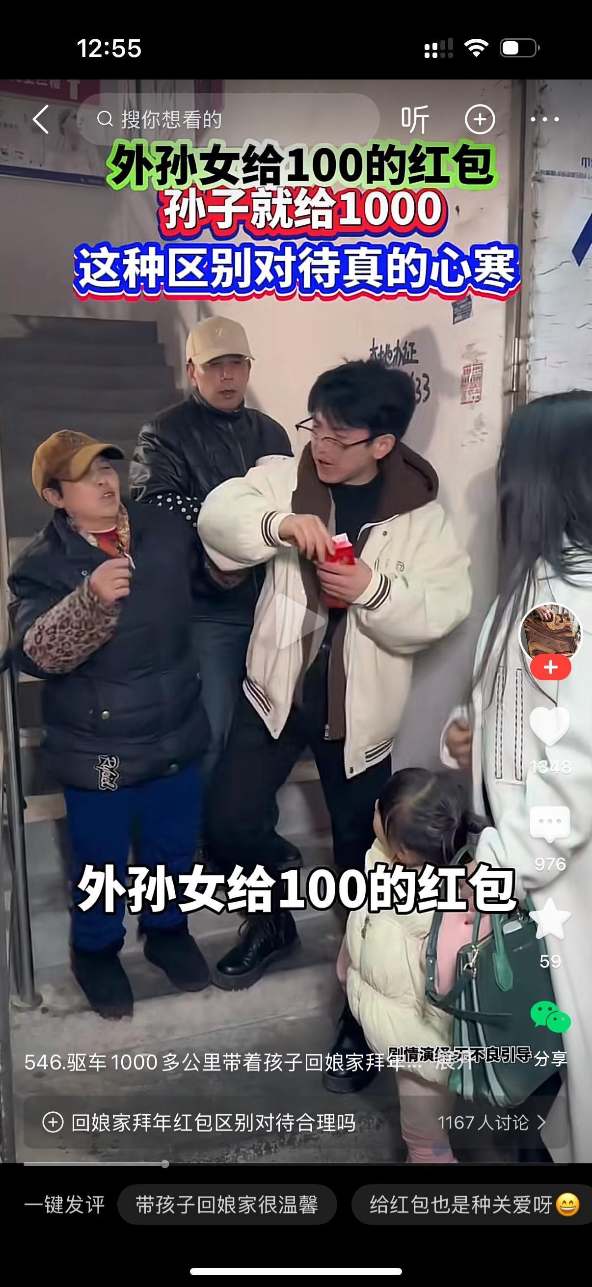 女婿因为丈母娘给孙子1000的红包,却给自己的女儿100块钱的红包生气不已。他觉得不应该这样区别对待孙子和外孙,应该一视同仁。女婿把红包还给丈母娘,说这饭不吃了。丈母娘一把拉住女婿,不要走啊,都要吃饭了。女婿执意要走,带着老婆和女儿火速撤离。老丈人夫妇心都碎了,给孙子1000,外孙女100有啥问题?孙子才是最亲的那个啊。