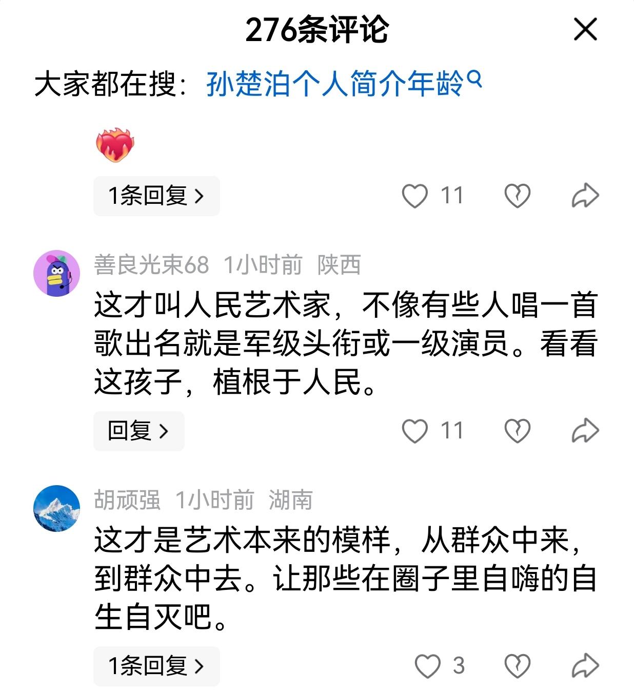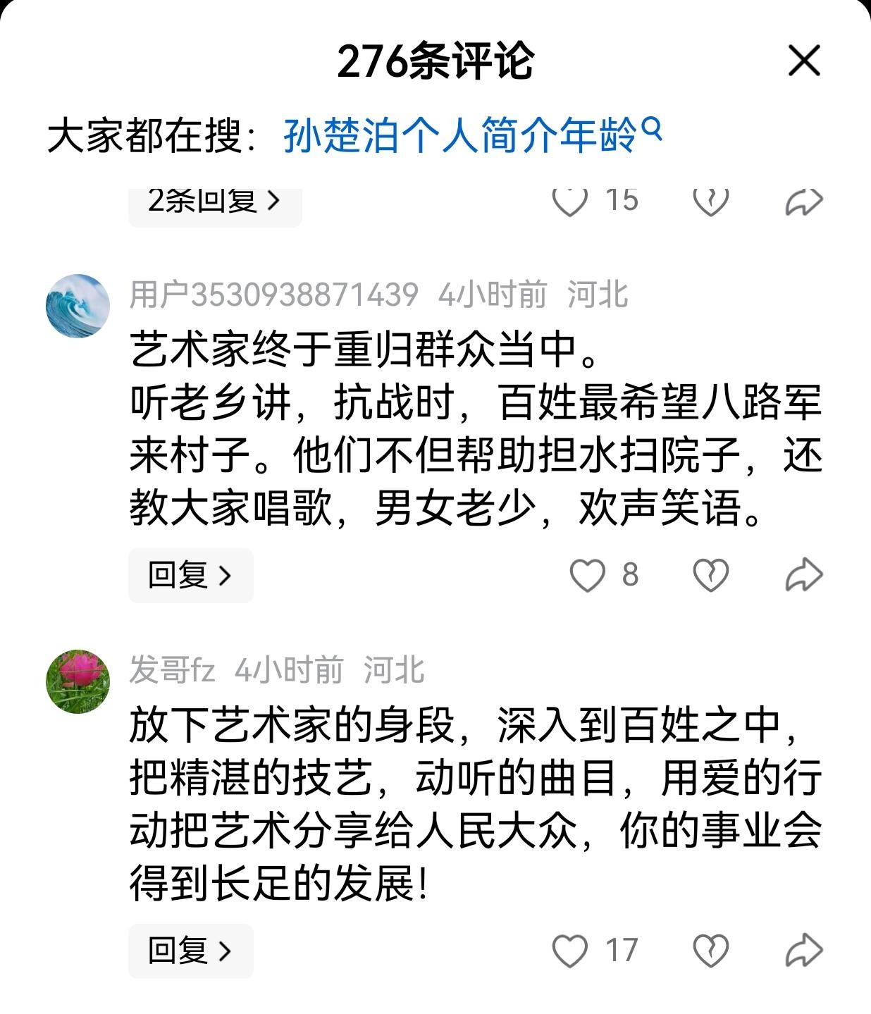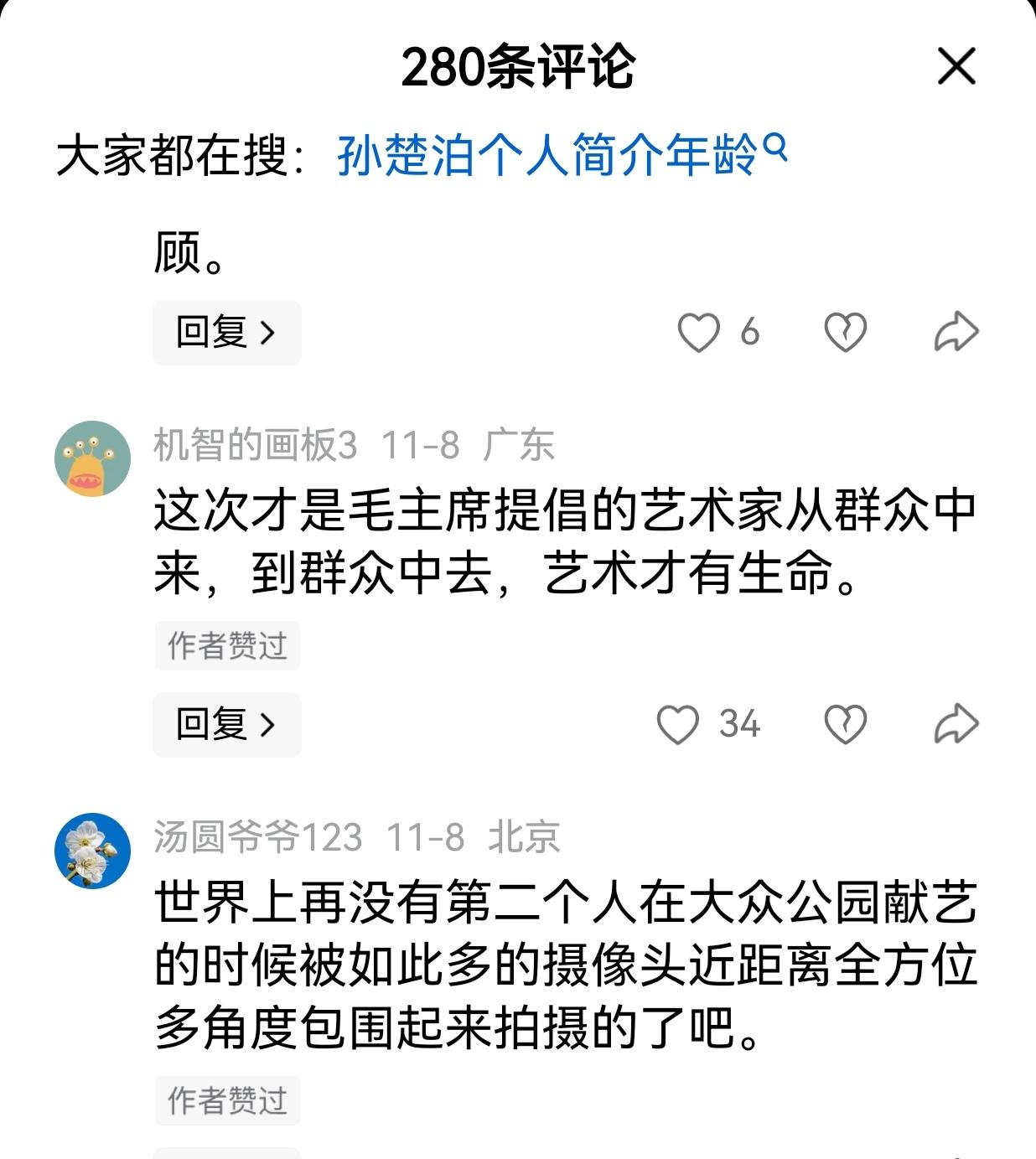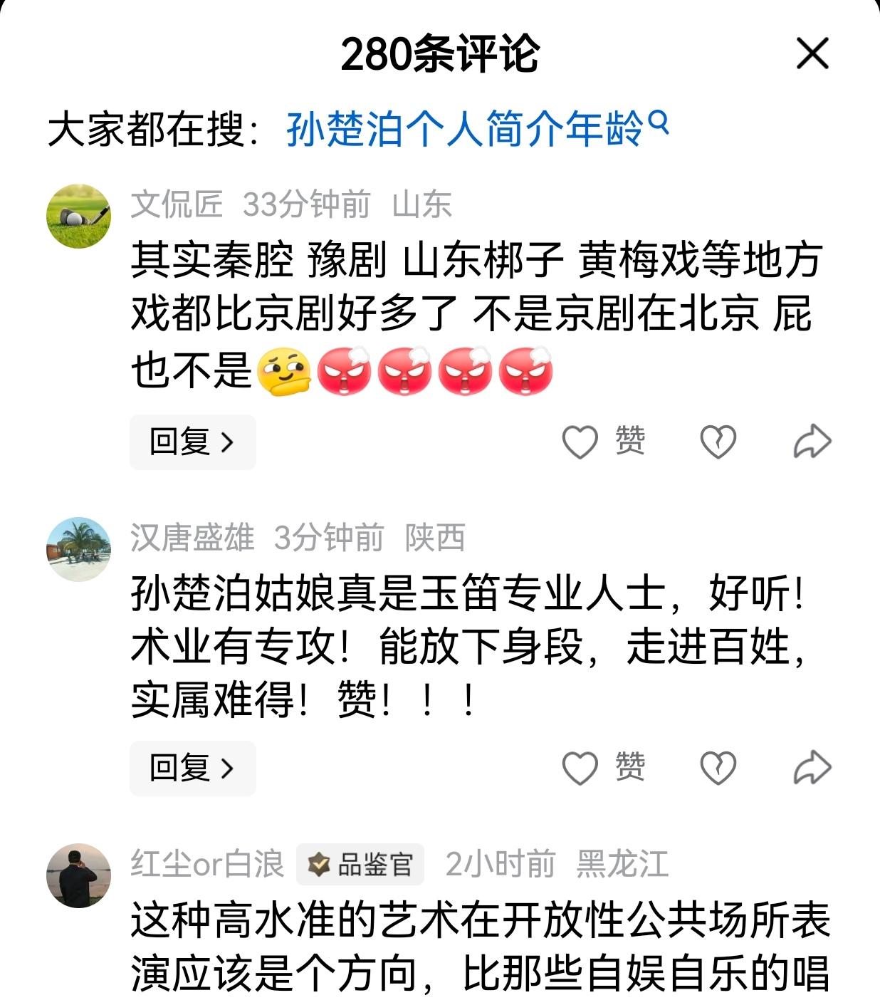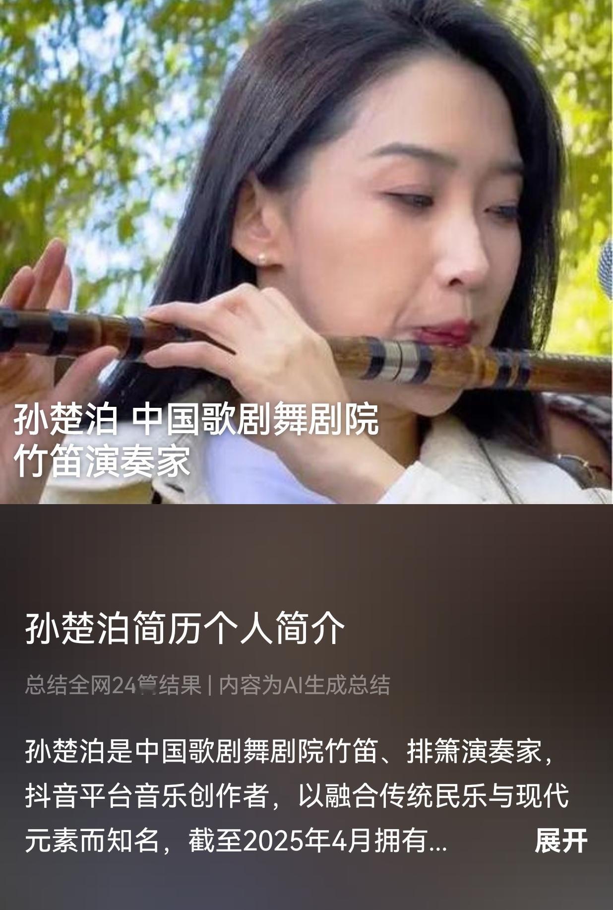 这是中国歌剧舞剧院民乐团演奏员孙楚泊,在北京公园现场为群众百姓演奏《秦腔即兴曲》,连树上都站了观众! 看到这场景,尤其是看了文末的评论,不禁让人感叹“人民艺术家”称号(称呼)的温暖之感! 孙楚泊毕业于沈阳音乐学院,中国音乐家协会排箫艺术研究会副秘书长及竹笛学会理事。