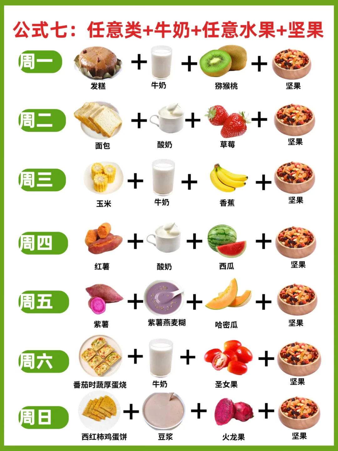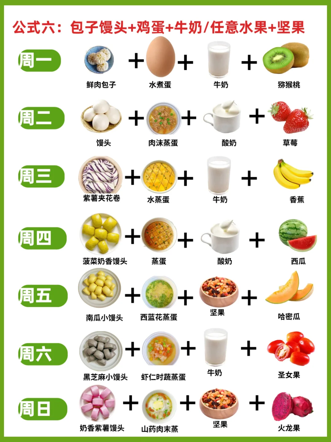 🔴公式六:包子馒头+鸡蛋+牛奶+任意水果+坚果