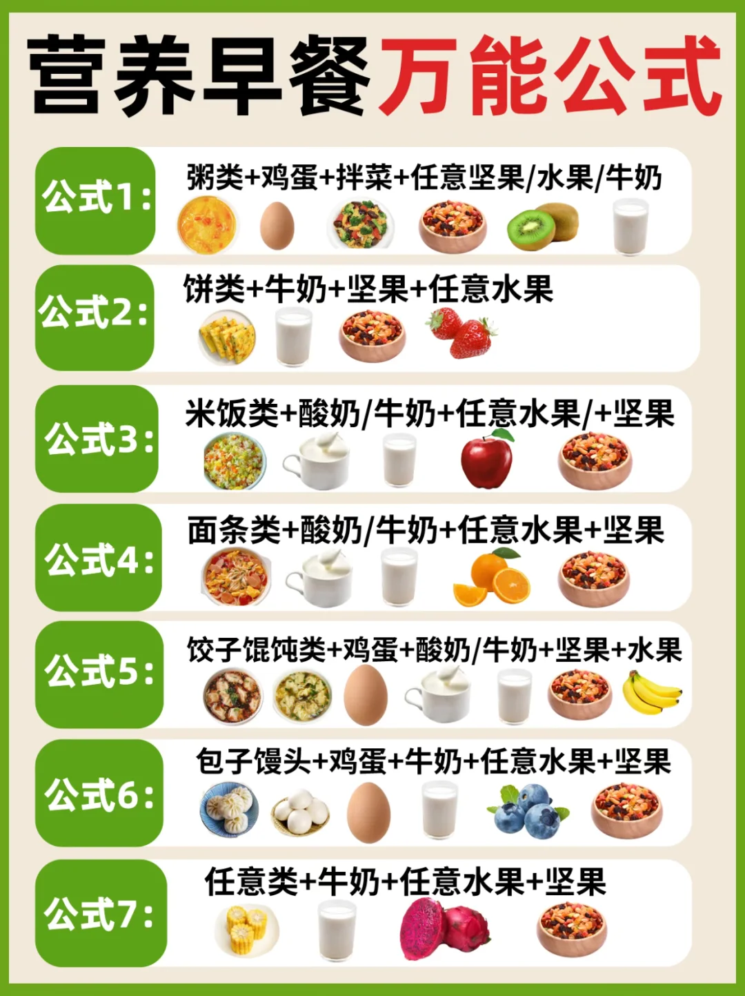 🔴公式一:粥类🥣+鸡蛋🥚+拌菜🥬+任意坚果/水果/牛奶