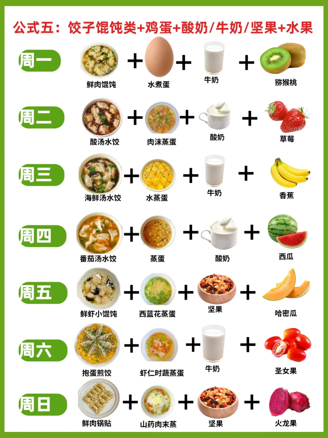 🔴公式五:饺子馄饨类+鸡蛋+酸奶/牛奶+坚果+水果