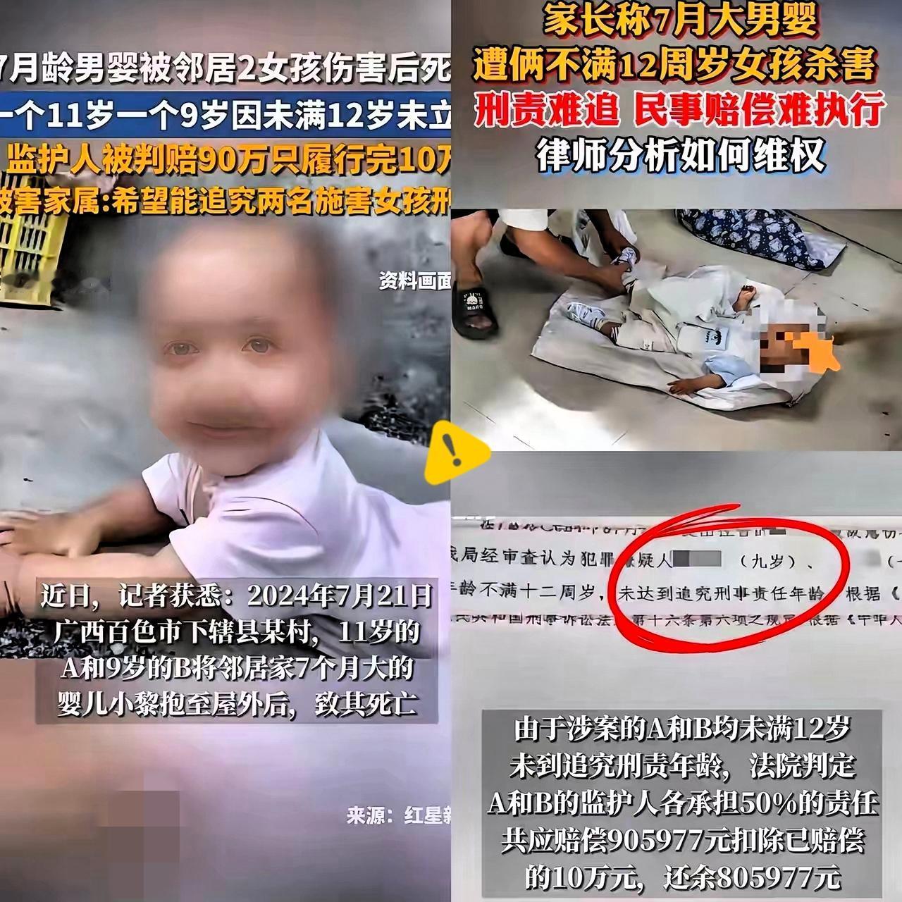 7个月大的宝宝没了 施暴的11岁和9岁女孩竟回校正常上课?这结果真的让人难以接受! 未满12岁不立案 90多万赔偿成了“白条” 年龄不该是恶行的“保护伞” 法律明确的专门矫治教育,就该用起来!封闭管理的惩戒,才是对生命的尊重,也是给孩子正确的引导。 纵容小恶只会养出大恶,别让下一个家庭再遭此不幸。 你认为专门矫治教育该强制推行吗?来评论区聊聊你的想法!