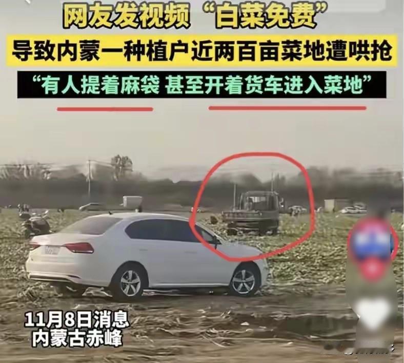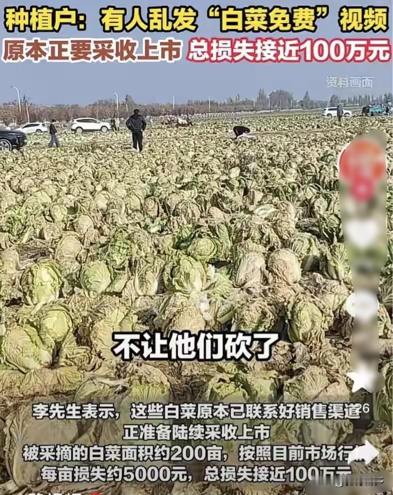 媒体发布白菜免费砍致使菜农损失百万元!11月4日,内蒙古一本地媒体发视频说赤峰市白菜免费砍,结果,导致七、八百人涌进菜农200亩地进行0元购白菜。 200亩地白菜,每亩卖5000元,共100万,这钱谁赔?