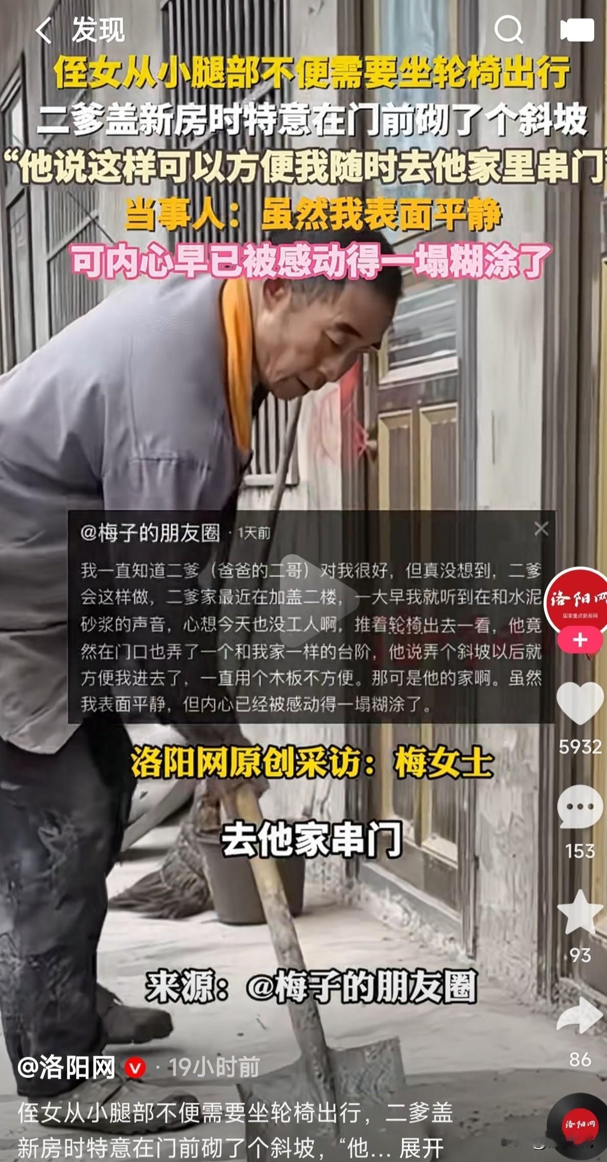 女子从小腿部不便需要坐轮椅出行,二爹盖新房时特意在门前砌了个斜坡,说是为了方便她以后随时去家里串门。 血缘关系的亲情是任何关系都替代不了的,这也许就是一个家族血脉的传承,谁能想到父亲的哥哥居然盖新房时能给自己专门弄个斜坡,就是为了出行不便坐轮椅的她随时去串门,不是亲爹胜似亲爹的大爱,也只有在亲情之间才能感受到,因为彼此都流着相同的血液,都是一个祖宗先人的后代,这让坐轮椅的女子是多么的感动。 身为残疾人的我着实能体会到那种出行不便的痛苦,别人都能体会到自己的不易,这是多么的难得,这份恩情一生难忘,愿每一个心地善良的人一生平安健康,所有的一切都顺风顺水!