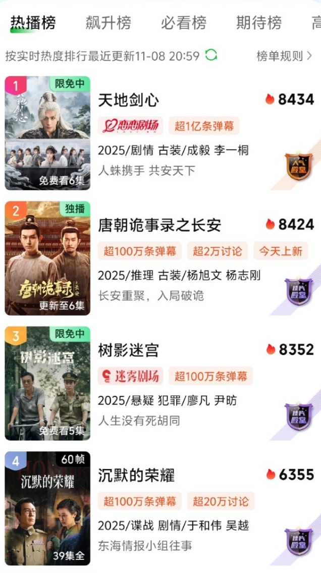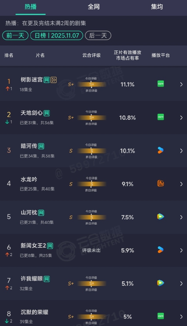 谁能想到,廖凡的《树影迷宫》赢过所有顶流一番大男主的作品,已经跃居云合榜首了,排在后面的分别是成毅、龚俊、罗云熙和宋茜,明天或者后天,这个榜单又要大换血了,《唐诡》应该能拿下第一吧。