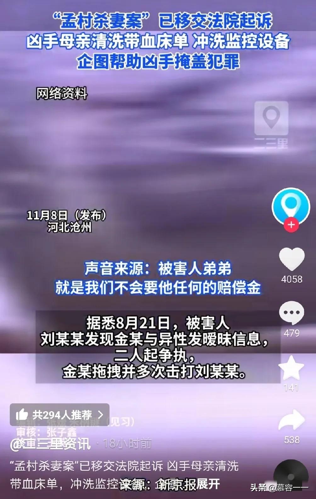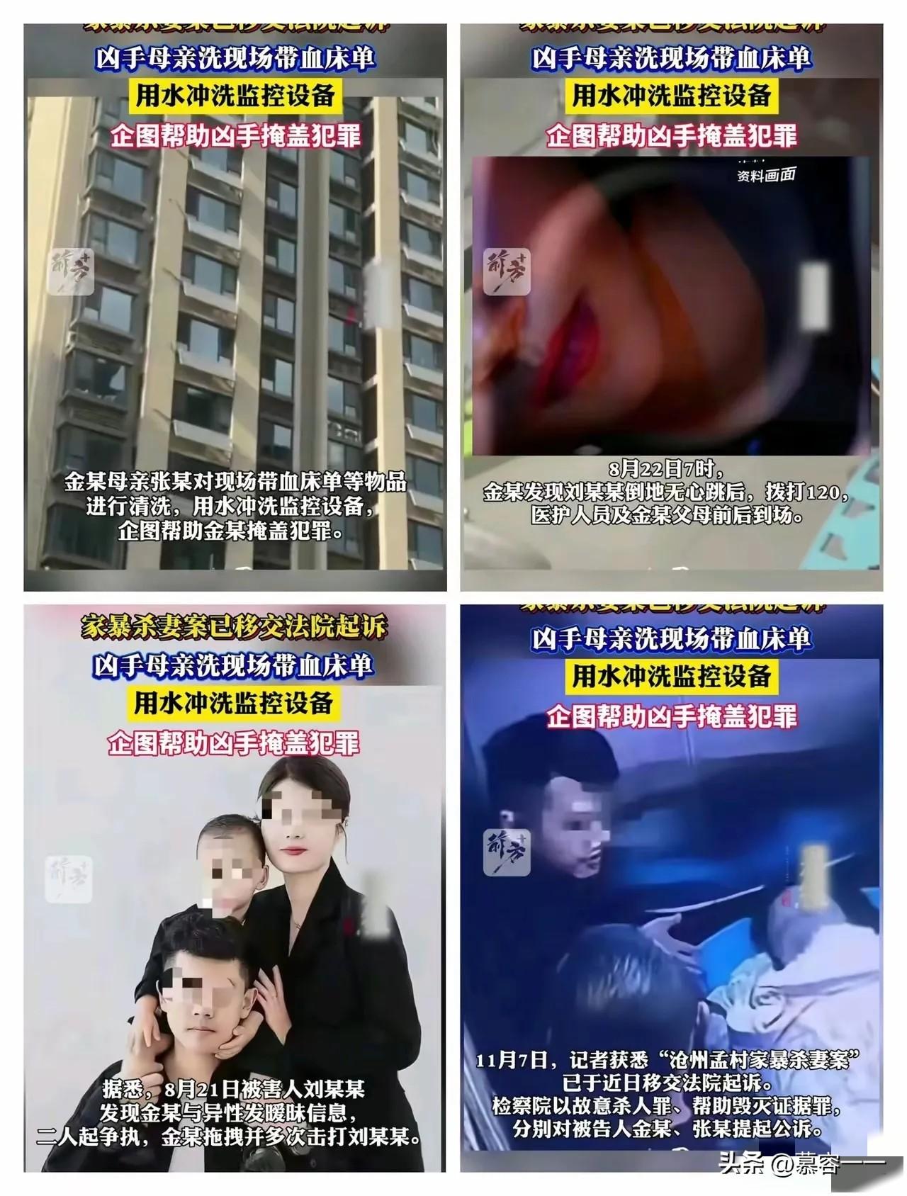 河北沧州孟村杀妻案,有大的进展了。 金某把妻子打死之后,他父母前后到达现场。母亲为了帮助金某,用水清洗了床单上和地面上的血,还有监控。 作为医生的她,还利用人脉资源,让医院医生出具儿媳死于心梗的报告单。 现在好了,检察院以“故意杀人罪”对金某提起公诉;以“帮助毁灭证据罪”对他母亲提起公诉。 这一幕也引发了网友的热议。 有的网友说:养不教母之过!这个母亲是一个失败的女人!她失败的育子观念,造成了以后一系列的失败。 有的网友说:这进展来得太解气了!金某杀妻还想躲,他爸妈居然帮着藏证据,一家子心都黑透了!希望狠狠判,必须给女方一个公道! 有的网友说:小三和那个帮助出假证明的医生都不能放过,必须追责! …… 法网恢恢疏而不漏!希望不久,会看到严惩金某和他母亲的判决结果!