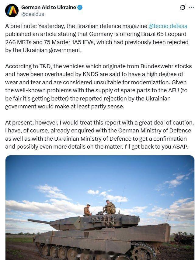 巴西军事媒体报道称,德国向乌克兰提供的一批65辆豹2A6坦克和75辆黄鼠狼1A5步兵战车因磨损严重和备件不足被乌克兰方面拒绝了,目前被转手给了巴西。这么多坦克和步战车,拆卸拼凑一下,也能弄出几十辆堪用的吧。要饭的还挑挑拣拣,要饭要得这么硬气的也就泽圣了。