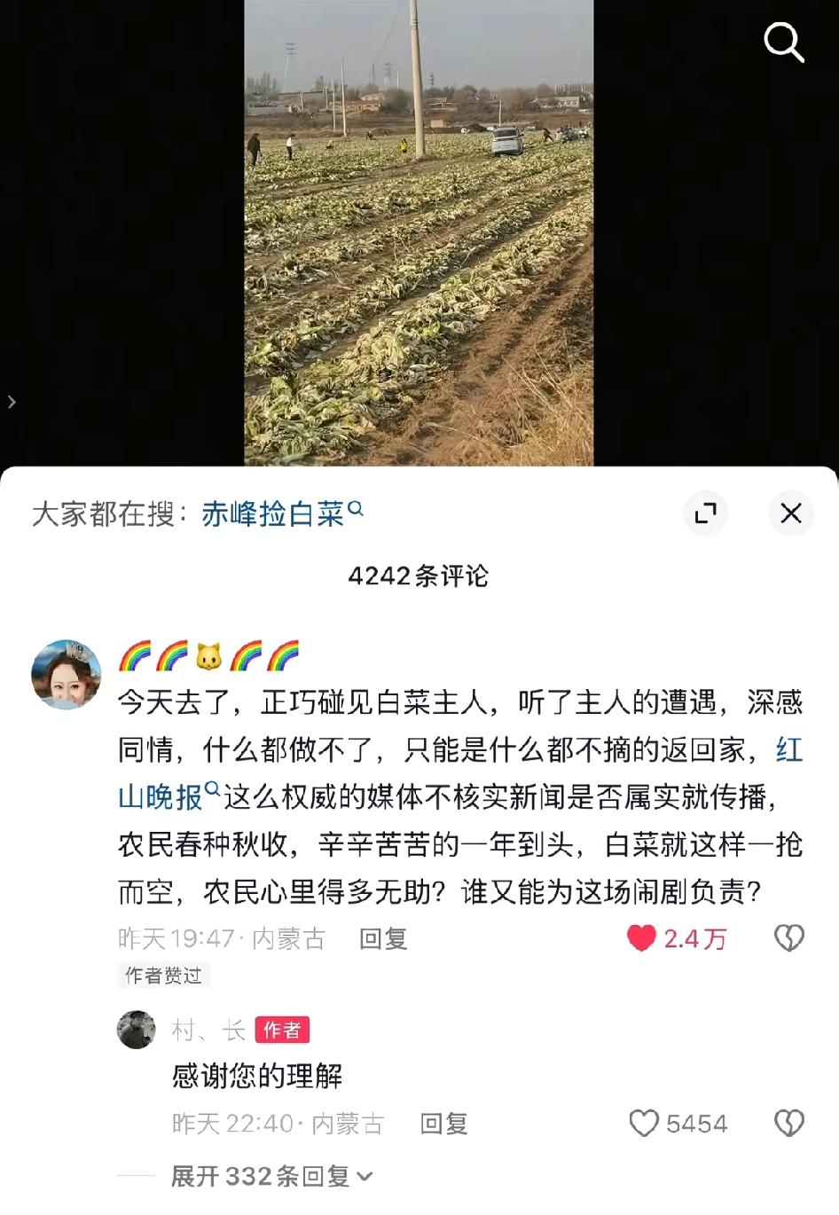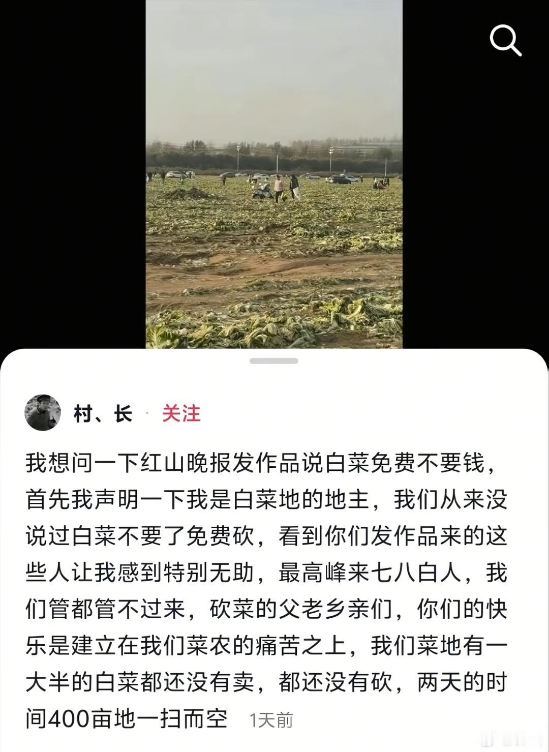 一条未核实的信息导致菜农400亩白菜被抢,谁来为这场闹剧负责?真是躲过了天灾没躲过人祸,红山晚报现在隐藏视频关闭评论,白菜地主人被迫视频下架。最高峰七八百人,很多人开的车来砍,我都能感觉到菜农的无奈,辛苦一年就这样被抢了,谁来为他们做主挽回损失。