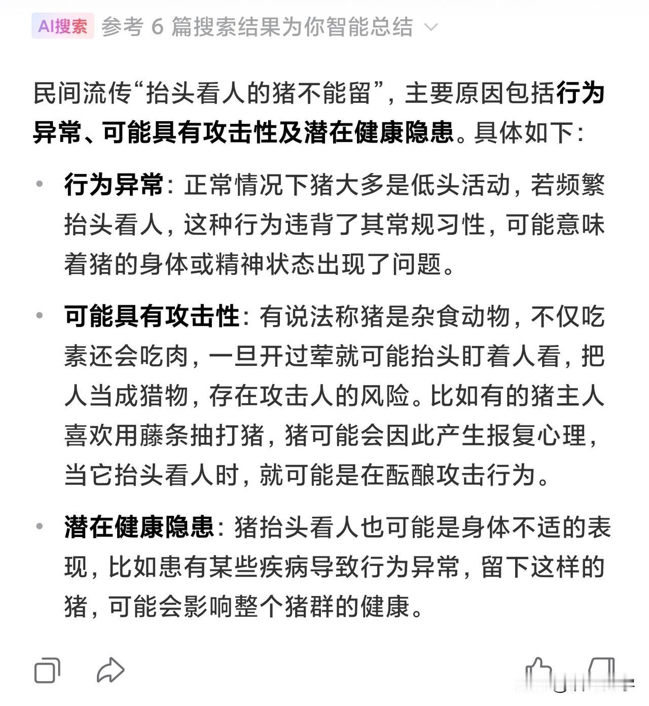 民间流传一句话,“抬头看人的猪不能留”,不知道这句话有没有科学依据,总之,这是老人通过生活实践得出来的养猪经验。通过AI搜索功能,总的来说有三点原因,第一,行为异常。一般来说正常的家猪是低头活动的,若频道抬头,可能猪的身体出现了状况;第二,可能具有攻击性。如果主人频繁用藤条抽打家猪,可能会被家猪记仇,抬头看人是为了记住你的长相,在酝酿攻击行为;第三,潜在健康隐患。经常抬头的猪可能有身体疾病,如果留下来可能会传染给其他的猪。所以,不管是不是真的,还是不能留更靠谱一些!猪 猪抬眼 猪不能抬头 猪异常行为 抬头猪 猪脸识别 猪去势