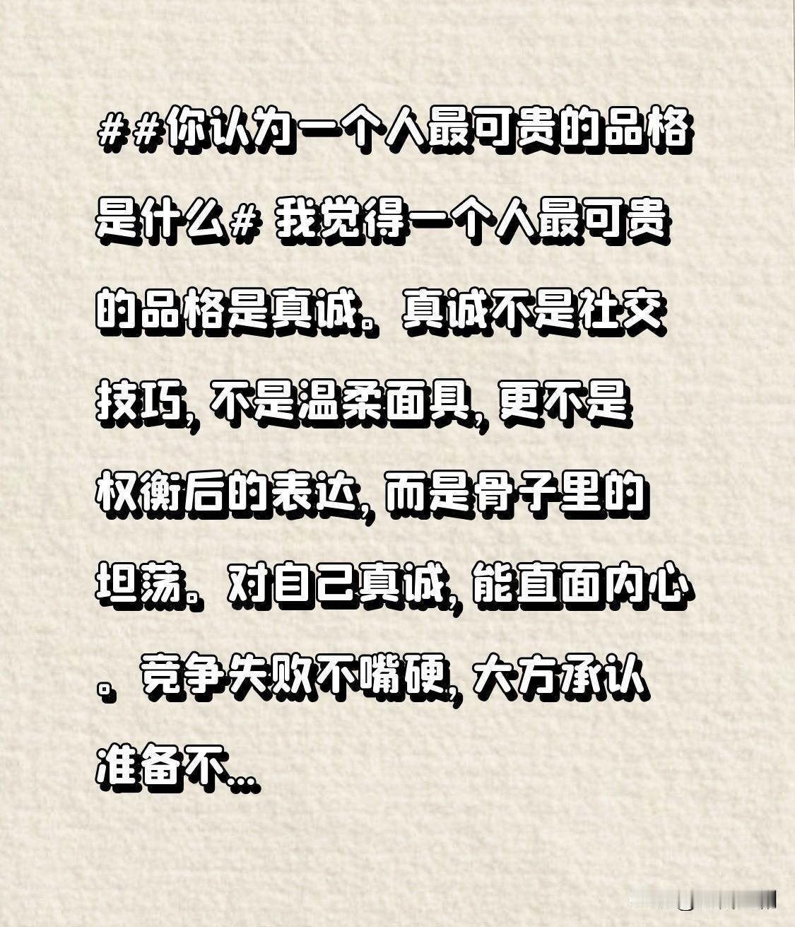你认为一个人最可贵的品格是什么 我觉得,一个人最为可贵的品格莫过于真诚。真诚绝非社交技巧,不是温柔的伪装,更不是权衡利弊后的话术,而是源于骨子里的磊落。 对自己保持真诚,就能直面内心。竞争失败时,不硬撑面子,坦然承认准备不够充分;面对赞美,不假意谦虚,真诚表达内心的欣喜。接纳真实的自己,无论优点还是不足,内心会逐渐强大,无需维持“完美人设”,可将精力都用于自我成长。 对他人秉持真诚,不用欺瞒对待。朋友的衣服不太合身,就温和地指出颜色与肤色不太搭调;同事的方案存在瑕疵,就坦诚地说明问题所在。唯有真诚待人,才能收获真心。