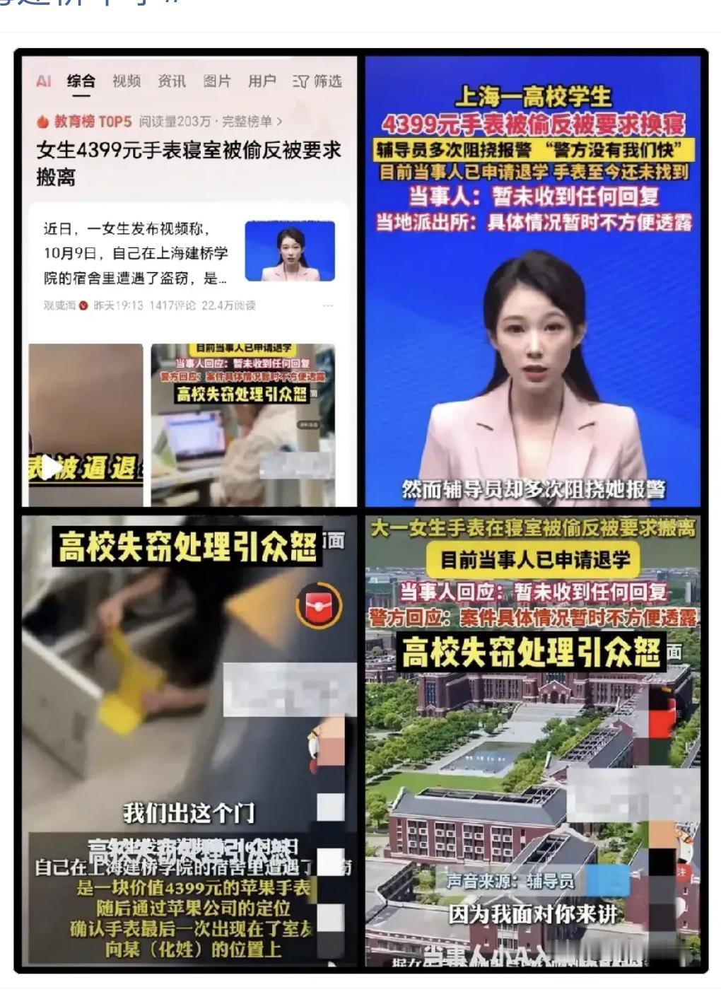 上海建桥学院的这位辅导员这会儿估计肠子都悔青了吧, 没想到学生都退学了,还会被曝光出来自己做的那些事,可能会挺社死的吧! 上海建桥学院的辅导员真是太“牛”了,学生被盗了,辅导员居然让学生退学!事情是这样的,一名新生,刚开学几天,手表被盗了。 辅导员来了,不是安慰学生说几句好听话,而是让学生不要报警,更加不要查监控,随后就让被盗的学生搬出宿舍,这名学生心寒之下选择了退学。 辅导员的这个处理方式,我真是佩服,完全不符合处理问题的基本原则。 学生被盗了,正常情况下,应该报警,让警方介入调查,辅导员作为老师应该支持学生报警,辅导员怎么连最基本的法治意识都没有? ​ 辅导员就希望学生乖乖听话,如果不听话,就让他退学!这件事辅导员处理结果让被盗学生心寒退学了,而辅导员却逍遥法外。 辅导员这处理问题的方式,完全是不以事实为依据,而是以个人喜好为依据,人为的制造了恶性事件。 网络一片骂声,网友说:辅导员不能这样做,这样做要不要负责? 网友说:这样的辅导员豪无道德观念,怎么处理了???