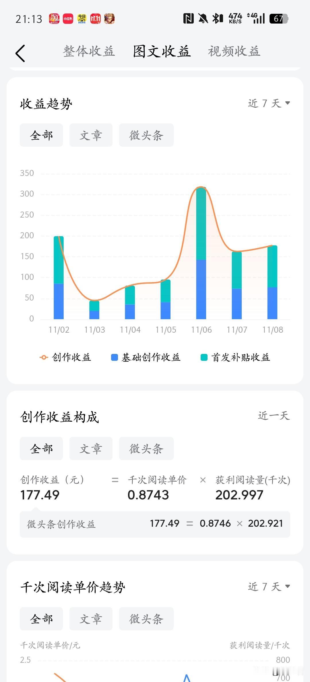今天在头条上挣了177.49元,单价是0.8743元。虽然不及那些大佬的十分之一,但是作为普通人算是可以的了,不管多少,只要有就行。 看到素老三晒的收益每天都是几百甚至上千,真羡慕他们有这才华,在头条上也能赚钱。