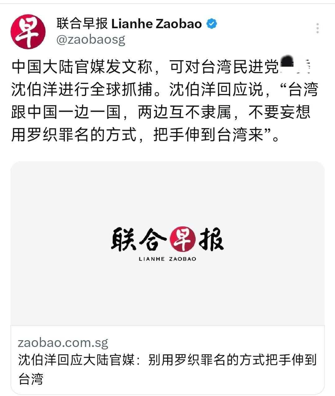 新加坡联合早报今晚(11月9日晚)报道:“中国大陆官媒发文称,可对台湾民进党民代沈伯洋进行全球抓捕。沈伯洋回应说,‘台湾跟中国一边一国,两边互不隶属,不要妄想用罗织罪名的方式,把手伸到台湾来’。” [机智]评几句:沈伯洋不妨亲身验证中国大陆是否只是虚张声势,白家父子的前车之鉴仍历历在目。作为美国民主基金会豢养的傀儡,沈伯洋是彻头彻尾的汉奸卖国贼,其结局定不会比黎智英好上半分。别看他如今气焰嚣张,待到清算之日来临,定将牢底坐穿。而且,沈伯洋只要流窜到其他国家就很可能被引渡,估计以后只能躲在台湾过日子了。