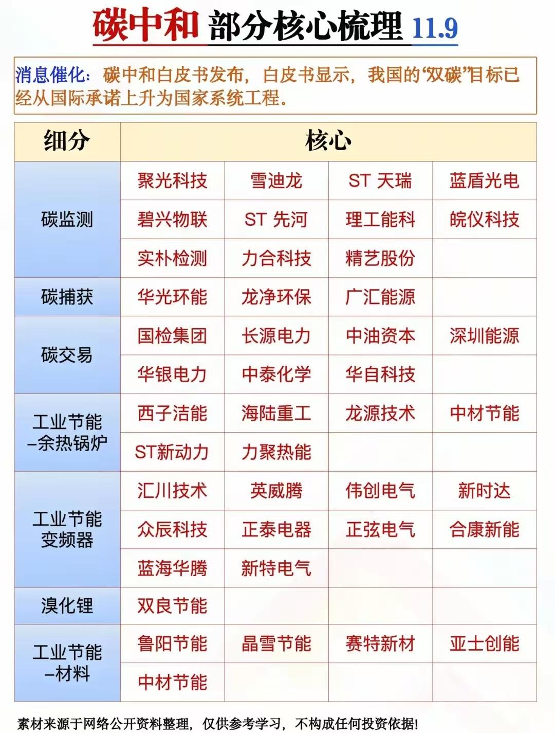 周末重磅利好来袭,11月8日国新办发布《碳达峰碳中和的中国行动》白皮书。明确非化石能源消费占比已升至19.8%,风光装机超16.9亿千瓦,新型储能装机达7376万千瓦……相关概念龙头代表有哪些? 据权威机构预测,中国碳中和相关产业市场规模年均复合增长率保持在12%以上 ,至2030年市场规模将进一步扩大至25万亿元以上 新能源行业作为碳中和的核心领域,风电、光伏等清洁能源将迎来快速发展。 碳中和概念核心龙头代表:隆基绿能(光伏龙头)、金风科技(风电龙头)、中国广核(核电龙头)、宁德时代(储能系统)、阳光电源(光伏逆变器)、国电南瑞(电网智能化)、中材节能(水泥余热发电)、昊华科技(CO₂捕集材料)、华测检测(第三方碳核查)…… 资料取材网络仅供参考,不能作为投资依据,理财有风险入市需谨慎!