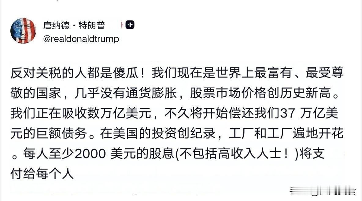 特朗普:除高收入者外,每个人都将获得至少2000美元!资金来源于美国关税收入