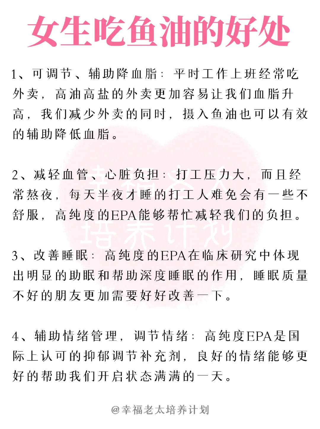 众所周知鱼油对我们有好处,那么女生吃鱼油都有哪些好处呢,今天整理出来分享给大家🔥 1、可调节、辅助降血脂:平时工作上班经常吃外卖,高油高盐的外卖更加容易让我们血脂升高,我们减少外卖的同时,摄入鱼油也可以有效的辅助降低血脂。 2、减轻血管、心脏负担:打工压力大,而且经常熬夜,每天半夜才睡的打工人难免会有一些不舒服,高纯度的EPA能够帮忙减轻我们的负担。 3、改善睡眠:高纯度的EPA在临床研究中体现出明显的助眠和帮助深度睡眠的作用,睡眠质量不好的朋友更加需要好好改善一下。 4、辅助情绪管理,调节情绪:高纯度EPA是国际上认可的抑郁调节补充剂,良好的情绪能够更好的帮助我们开启状态满满的一天。 这款MegaGold鱼油,高纯度EPA对女性健康很有帮助♥