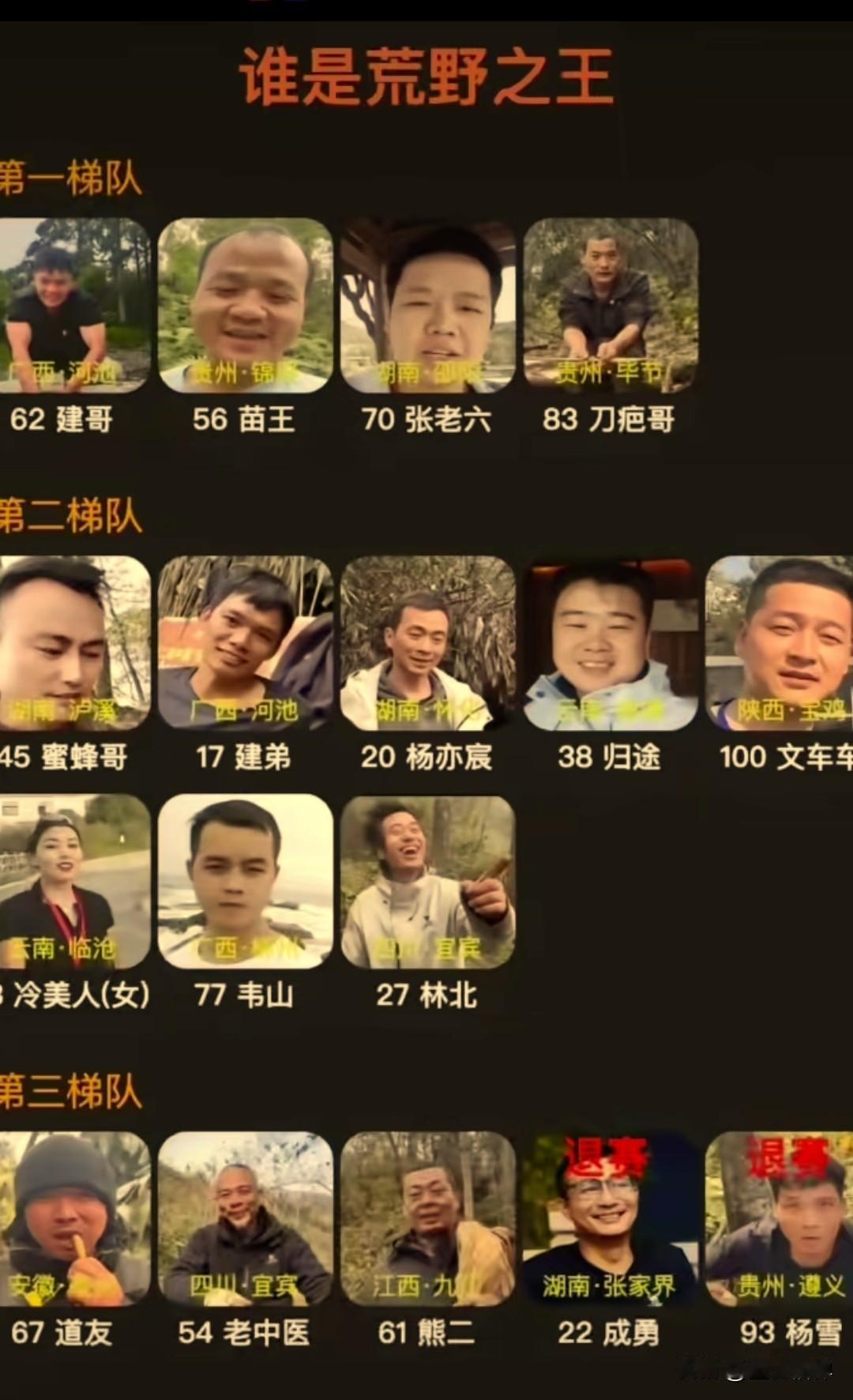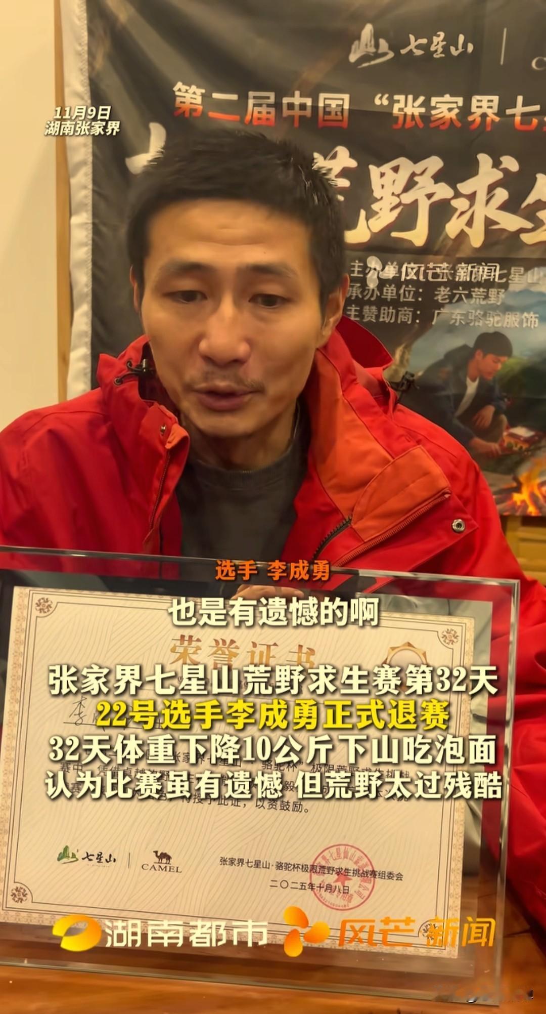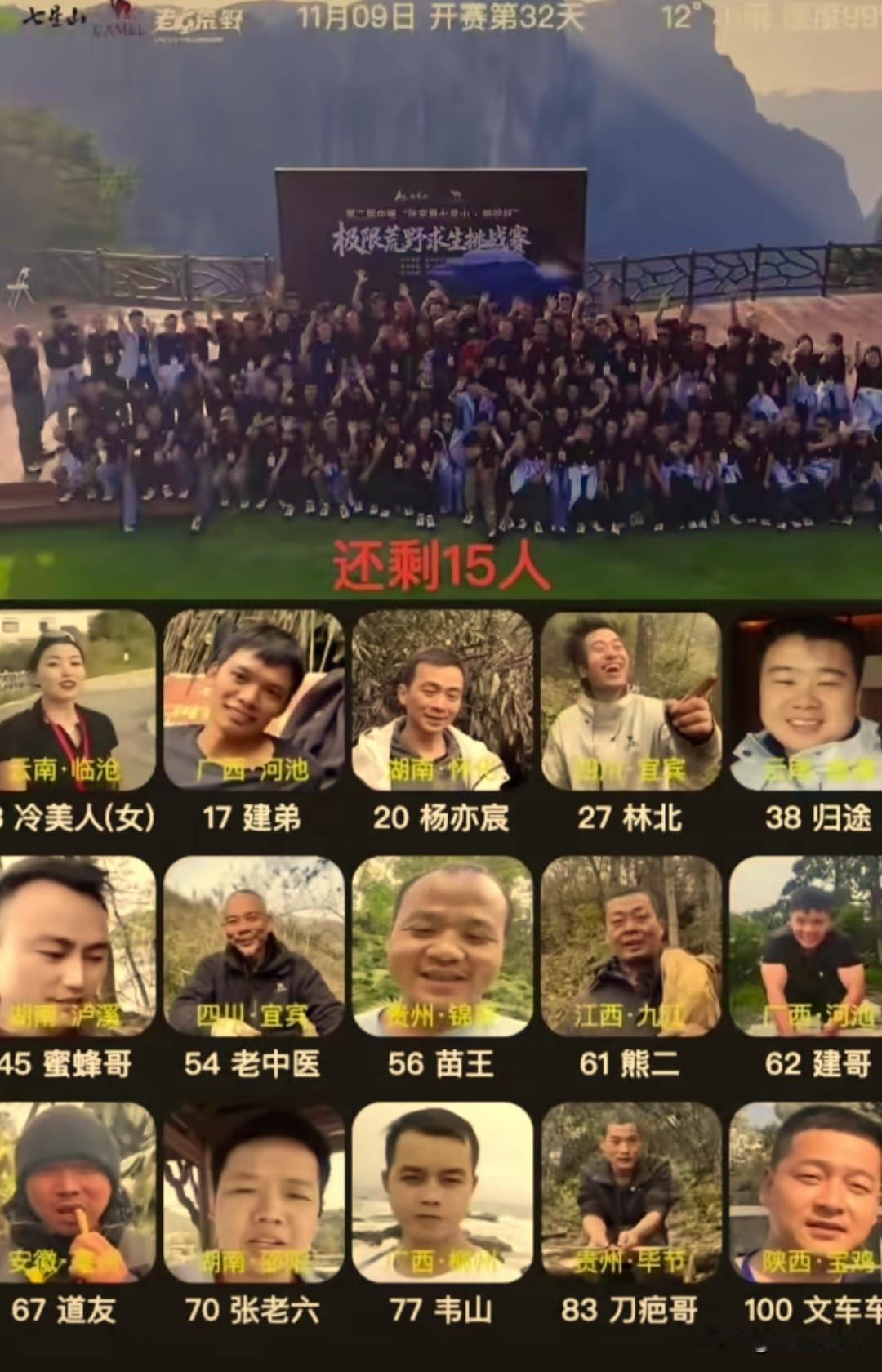 张家界七星山荒野求生挑战赛,李成勇退赛,目前赛场上只剩下15名选手,14名男性,1名女性,不知道最终谁能夺冠。 22号挑战者李成勇坚持了32天终于撑不住了,选择了退赛,下山称了一下体重瘦了22斤,当吃到饭的时候说碳水和肉类简直是美味无比啊! 目前大家看好第一梯队四人:建哥、苗王、张老六、刀疤哥,这四个人综合实力比较强,状态也比较稳定,看谁能坚持到最后。 冷美人杨朝芹作为场上唯一的女选手,也展现出了惊人的毅力,在比赛中能够克服生理期、迷路、受伤等多重困难。 在连下4天雨,浑身湿透,快来生理期肚子痛,仍不放弃,找了一个山洞作为庇护所,并生了火,工作人员感叹:“你太强了”! 七星山荒野挑战 张家界户外求生 荒野求生打火石 荒野七星山 荒野冠军 成都荒野求生赛 野人拔旗挑战赛