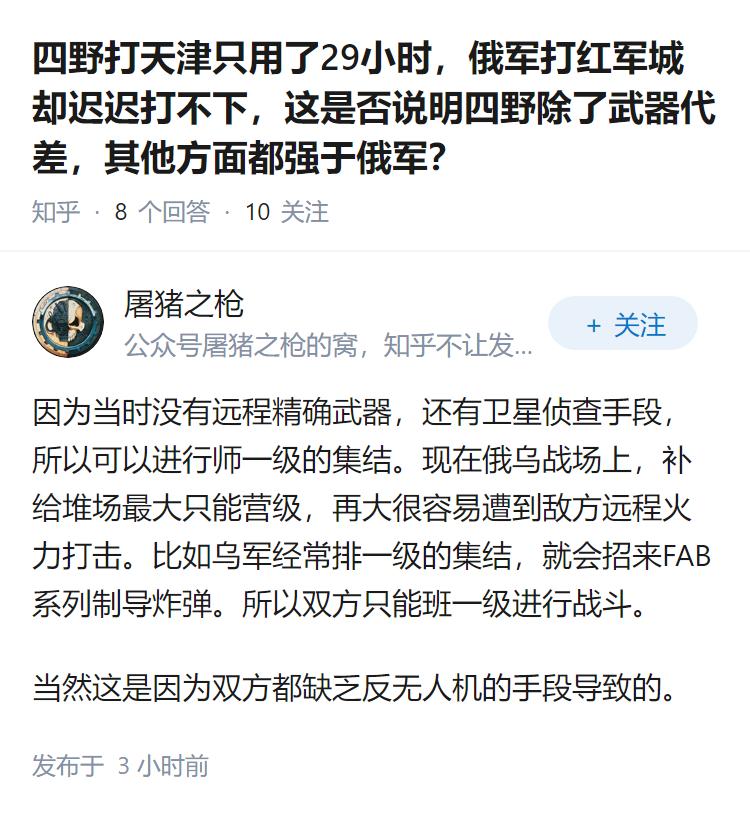 四野打天津只用了29小时,俄军打红军城却迟迟打不下,这是否说明四野除了武器代差,其他方面都强于俄军?