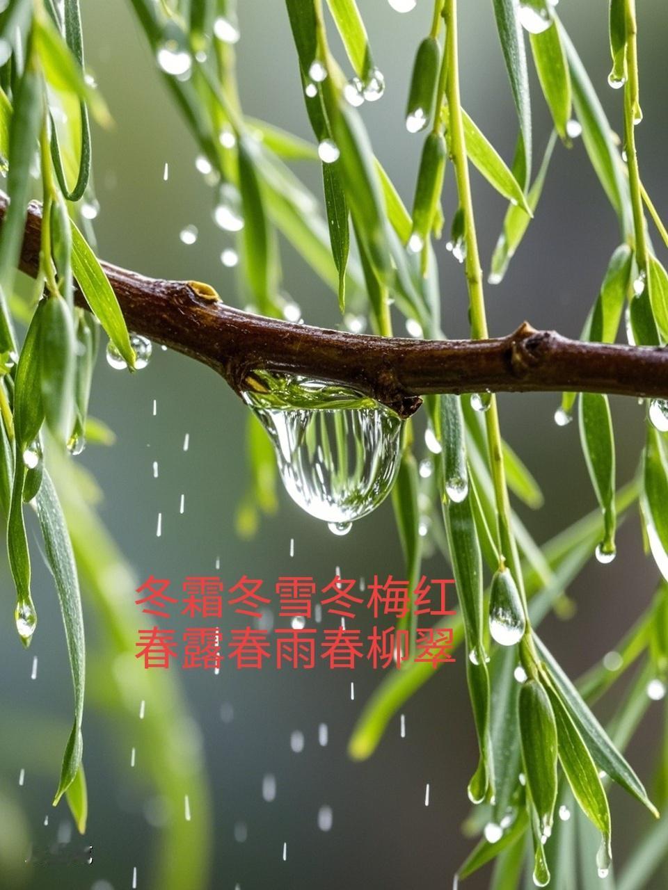 下联:冬霜冬雪冬梅红,对上联冬霜冬雪冬梅红,春露春雨春柳翠。冬霜对春露,名词对名词,冬雪对春雨,自然实物对自然实物,冬梅红对春柳翠,冬春相对,梅柳相对,红翠颜色相对。上联意境:冬季,天地白茫茫一片,在那纯白之中,有数点艳红绽放,在人脑海中自然形成了一幅画。下联意境:春风里,春雨如丝,河边垂柳已发翠绿新芽,泛出隐隐春意,也可脑中成画。[捂脸]