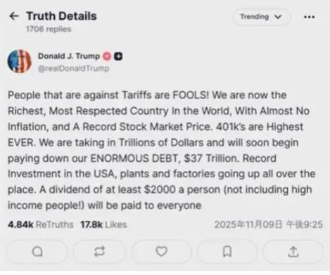 美国总统特朗普宣布,他将把关税收入作为财政资源,向除高收入者之外的所有公民支付2000美元。 特朗普总统9日在自己的社交媒体上发文称,“反对关税的人都是傻瓜”,并强调“我们正在筹集数万亿美元的资金,很快就会开始偿还37万亿美元的巨额债务”。 特朗普总统还明确表示,除高收入者外,所有公民每人至少可获得 2,000 美元的股息。 最重要的是,据说“没有关税就无法实现”。 目前,美国最高法院正在提起诉讼,质疑互惠关税的合宪性,但特朗普总统6日表示,如果判决被认定违宪,他打算考虑替代方案。
