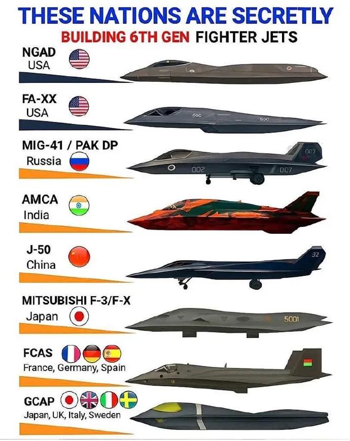 六代机,只有中国取得了突破,美国现在还没捅破窗户纸,至于其他国家,也就停留在制作PPT的阶段。 图为印度网友整理的全球六代机发展情况,但这个信息显然是滞后了,美国的NGAD和FA-XX前几年吆喝地震天响,现在都没了动静,美国以PPT方案展示的F-47顶多就是个5.5代,不过除了中国,美国是唯一一个具备研发六代机实力的国家。 俄罗斯的米格-41,看看就行了,苏-57都达不到五代机的性能标准,俄罗斯现在不具备研发六代机的实力,别的不说,先进航电俄罗斯就没有解决方案。 至于欧洲、日本、印度这些六代机,这些国家和地区五代机全套技术都没有,拿什么研发六代机?战斗机研发是非常复杂、难度非常大的,没有坚实的基础连尝试的机会都没有!土耳其和韩国所谓的五代机,那根本就不是自主研发,相当于买来配件和技术方案组装的低配版五代机。