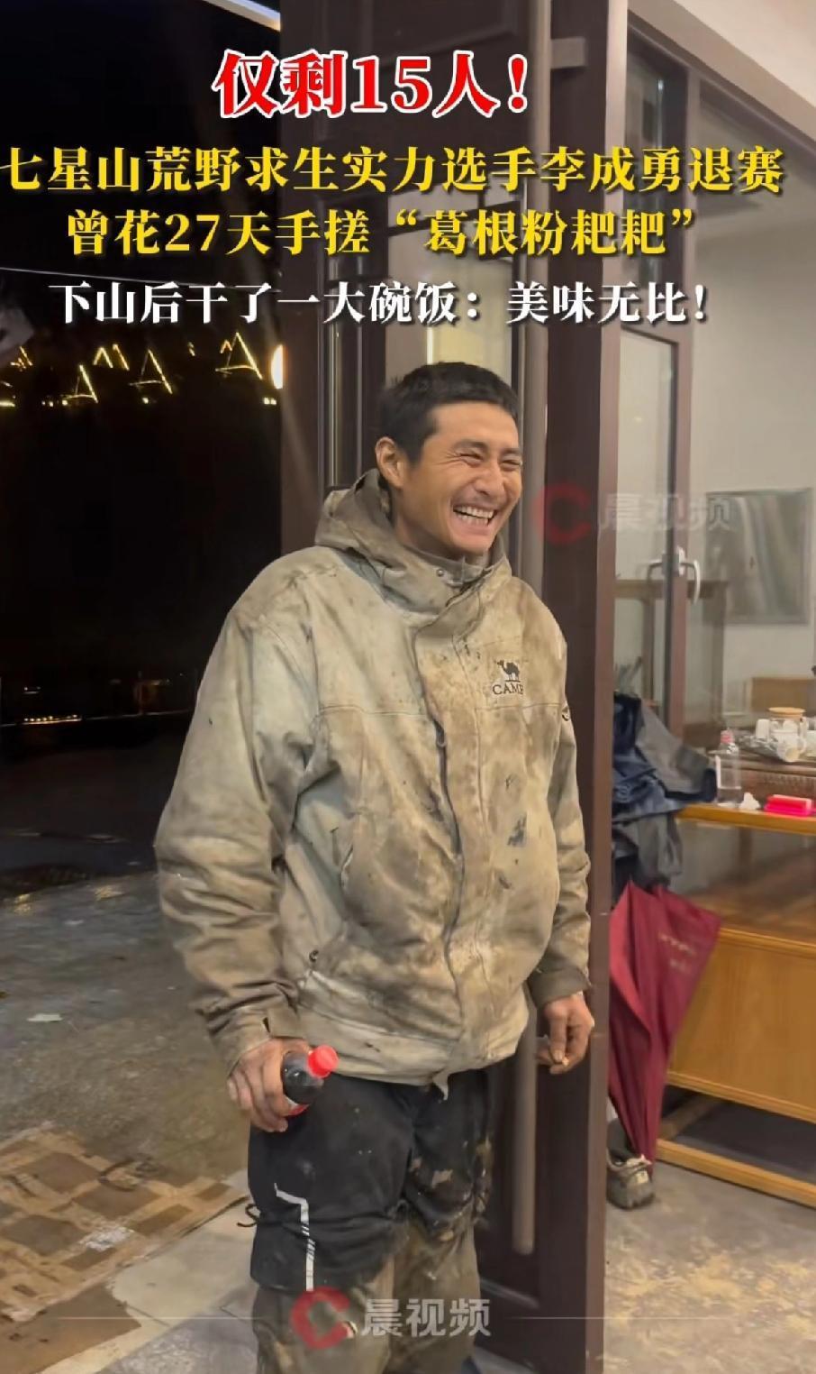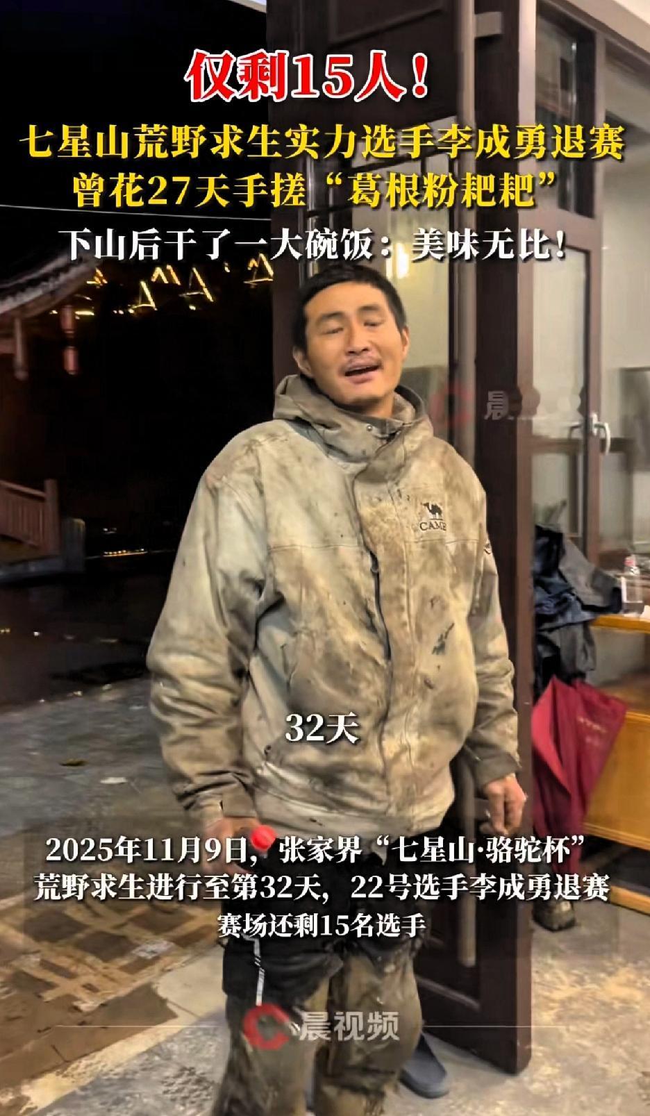 仅剩15人,七星山荒野求生实力派选手李成勇退赛,曾花27天手搓“葛根粉粑粑”,这毅力真让人佩服。 这场比赛从100人开始,状况不断。有选手抓到野猪大快朵颐,结果赛事方称是提前投放的驯养二代野猪。 想不通李成勇的制作淀粉的容器才做好,葛根粉也做好了,为什么突然退赛了? 还是因为有的选手抓到一只野猪,觉得没有夺冠可能了,就选择退出了? 看到他花费那么久的时间,用树身做了那么大一个制作淀粉的容器,才做好没用两次就退赛了实在是可惜! 不过李成勇坚持了32天,外形上没有那么大的反差。不像“猴哥”快饿成骷髅头了!还在坚持。 冷美人“杨朝芹”又要经历生理期,日子也是艰难的狠,快瘦成楼兰美女了。 现在赛场上剩下的都是实力更强的选手,节目也越来越有看头了。 比赛第31天,“荒野第一深情林北”玩不下去退赛。“冷美人”杨朝芹瘦成闪电,采野果野菜充饥,手指嘴唇都开裂了。 估计抓到野猪的那组选手“夺冠”的可能性大。别人都吃野菜和虫子补充能量,刀疤哥最多吃杰瑞! 他俩直接收获了头野猪,比赛都到了紧要关头了,这头野猪来的太及时了。 同样这头野猪也能劝退正在咬牙坚持的选手。 主办方说配备了安全员,每天清点人数,冠军奖金20万。李成勇的退赛让人有点意外,不知道剩下的选手谁能笑到最后。 越来越期待最后花落谁家!谁能拿大奖?谁才是那个野外生存能力最强的选手。