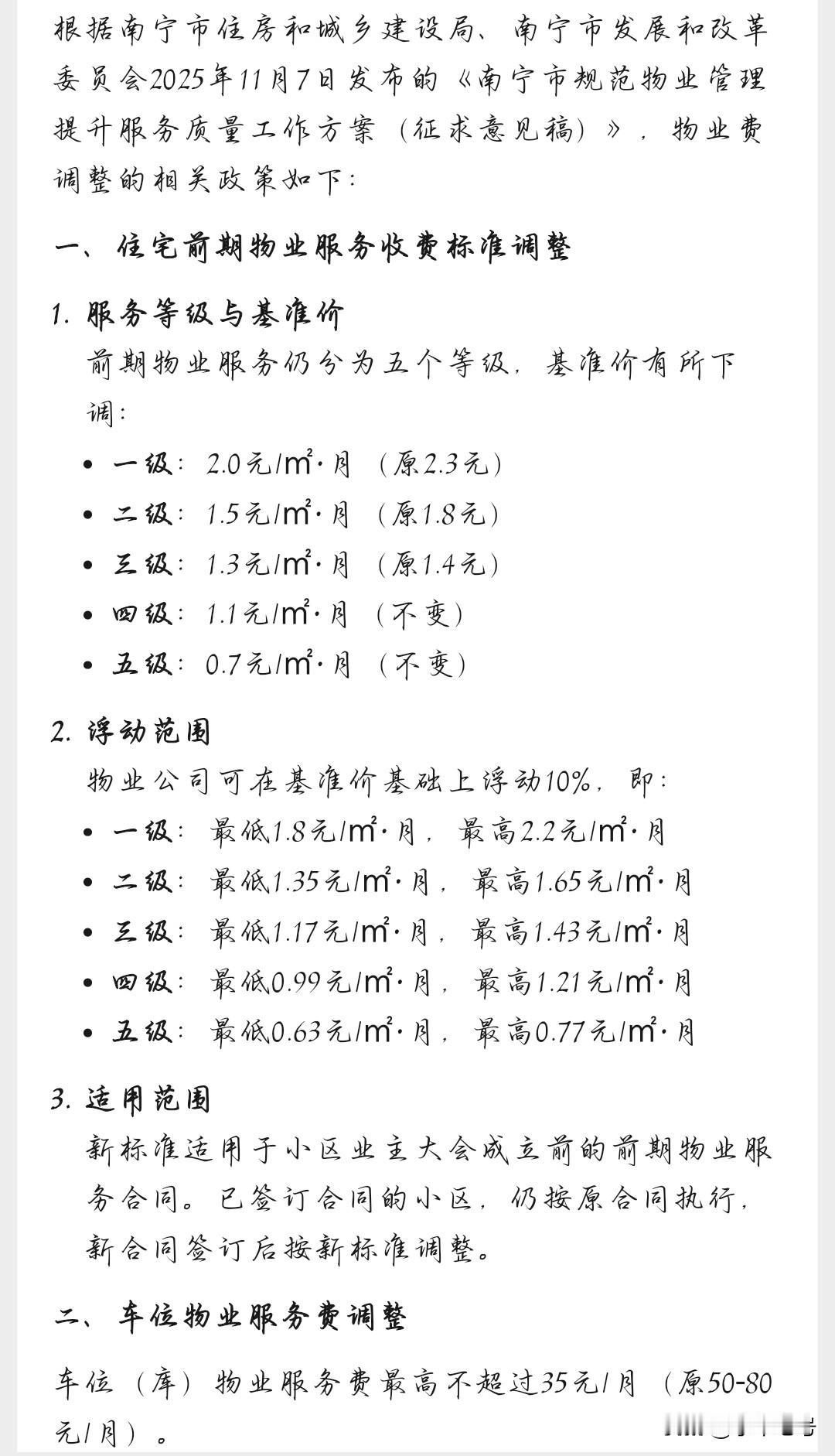 南宁献出新政策, 人人抱怨的物业费可能要降! 7号当天相关部门发布了关于规范物业管理的相关方案,征集意见,从新订标准来看,南宁物业费根据等级划分出现了小幅度下降调整,车位物业服务费也进行了调整,最高已经降至不超过35元/月!若方案能落地实施,虽然整体降幅不大,但对于大房子或多套房源的业主来说也是件好事! 物业费2.5元一方,是不是太贵了 物业费收费规则 物业费新政 南宁青秀房价