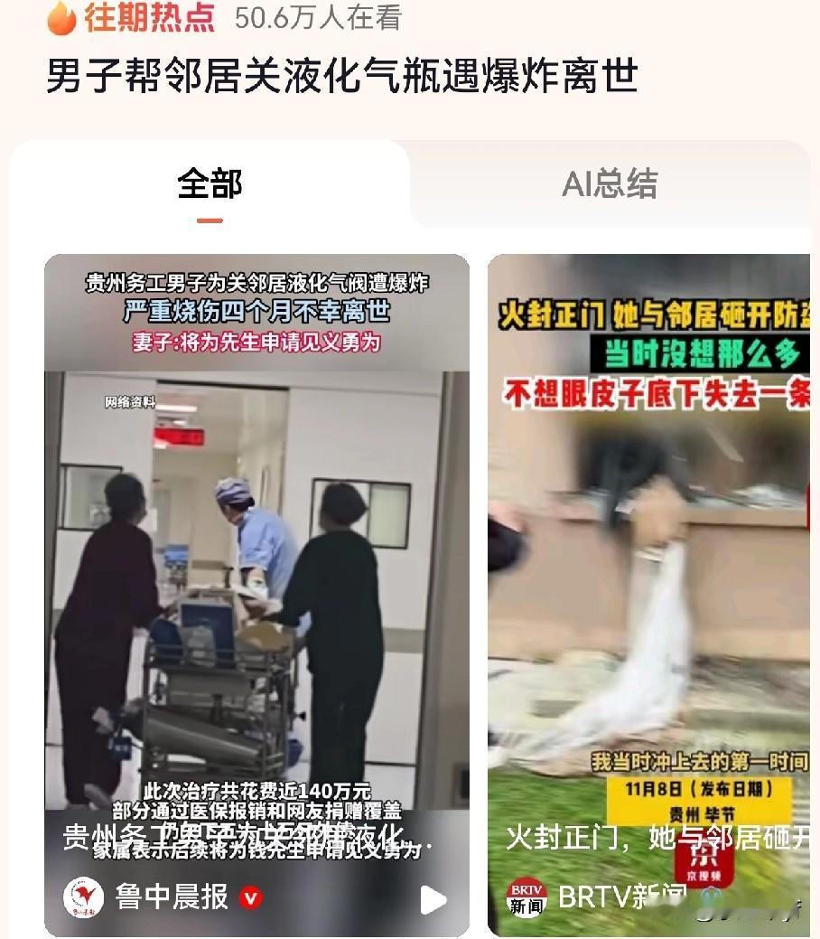 太惨了!男子帮邻居关液化气遇爆炸,花费近140万离世,欠了五六十万!妻子悲痛发声! 就在今年的7月2日,浙江绍兴有一名男子,帮助邻居关闭液化气,可万万没想到,就是这一次的好心之举,不但让他付出了生命的代价,更背负上了巨额债务。 该名男子来自贵州,他原本和妻子在浙江绍兴打工,结果在事发当天,邻居因液化气泄,于是他帮忙关闭,就在这时候突然发生爆炸,导致全身89%的皮肤被烧伤,在重症监护室治疗将近4个月,10月22日因创面恢复转至康复中心,可万万没想到,原本以为,他会慢慢的康复,可是到了第2天,却突发气管血管破裂,引发脑死亡,最终抢救无效,于11月2日19:00离世。 根据妻子的讲述,丈夫的衣服都烧没了,全身都白了,此次事故,不但夺走了钱先生的生命,更让这个家庭背负上了巨额外债。 治疗将近花费了140余万,部分的费用由医保报销,还有一部分是网友的捐赠,然而如今还欠下大约五六十万的外债。 如今钱先生的骨灰,已经被带回贵州老家,家属表示,会为他申请“见义勇为”,我们也衷心的希望,钱先生的善举,能够被追加。 另外根据亲属讲述,起初两个孩子还不知道爸爸已经去世了,以为还在治疗当中,看到小叔去学校接他们,还很开心,根据妻子发布的视频来看,两个孩子应该是在贵州老家读书,因为学校门口写的是“贵州省盘州第一中学”,所以估计他们连爸爸最后一面也没见着! 亲属不知该如何跟孩子讲,担心他们受不了,后来还是把这个残酷的事实告诉了他们,当孩子母亲走进来的时候,一家三口抱在一起痛哭,让人看了泪目。 钱先生的善意,是邻里之间最暖的光,但是他的英年早逝,更令人感到无比的痛心,上百万的医疗费,以及数十万的债务,却让这一份善意背了沉重的代价,这也提醒了大家,不能让普通人的挺身而出,只靠热血支撑,应该给予善意,更实在的保障托底。 同时也充分的表明,液化气存在一定的风险,千万不能疏忽大意,要合理规范使用,快要过期的液化气,要及时的更换!