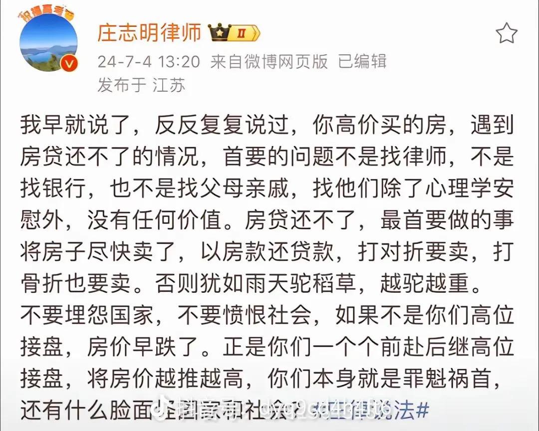 前几天,我发了一条写我高中同学在2019年高位买房后被亏损几十万的微头条。 这条微头条获得了平台十几万的展现,阅读量也已经达到2.4万了,很多朋友也分享了他们自己的经历,也有些朋友发表了很多精彩的评论和看法。 说实话,看完大家的评论之后,我也收获到了很多信息,对于这种踩在高位买房,如今住又住不了,卖又卖不掉的现象也有了更加深刻的看法。 我看到一位朋友的评论是分享了一张图片,这个图片里的内容是一位律师在2024年对于此类现象的一个评价,我觉得非常客观,也非常精准,同时也是很多当初购房者的心态变化。 只能说,咱们都是普通人,对于时代的变化,基本上都是没有足够和完整的认识的,只能被裹挟着往前走,是非对错现在再来评说也已经没有什么意义了。因为人生的道理是没有回头路的,既然是自己种下的因,结的果子也只能自己吃掉。 所谓落子无悔,只有坦然面对,因为,前路还很长!