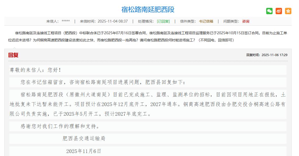 合肥宿松路南延肥西段(原徽州大道南延)最新进展。 目前已完成施工、监理、监测单位的招标,目前因项目用地正在报批,土地批复未下达暂未能开工。项目预计在2025年12月底开工,2027年通车。铜商高速肥西段由合肥交投合桐高速公路有限公司负责实施,已于2025年5月开工,预计2027年底完工。