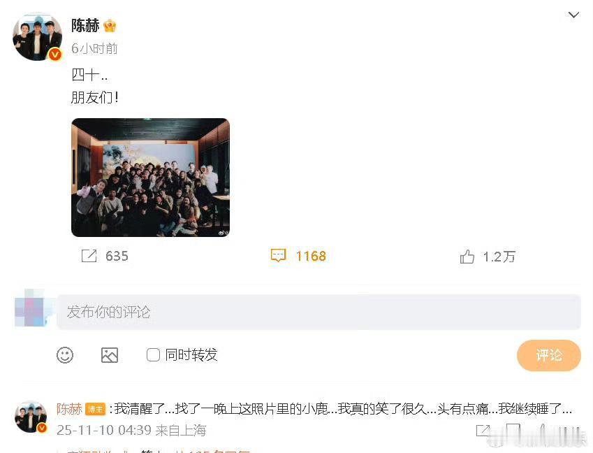 笑不活!陈赫40岁庆生照找鹿晗找疯了,邓超吐槽亮了! 9号陈赫迎来40岁生日,邓超、鹿晗凌晨准时送祝福,超哥催他“四十不惑,成熟点”,小鹿更扎心:“要不少吃点小龙虾吧!” 深夜陈赫晒出好友大合照,结果3小时后急得补评:“找了一晚上小鹿,笑到停不下来!” 网友定睛一看,鹿晗直接“隐身”在人群里,低调到差点被忽略,这波“神仙友情”又搞笑又好嗑,三人同框画面感拉满,谁懂啊!