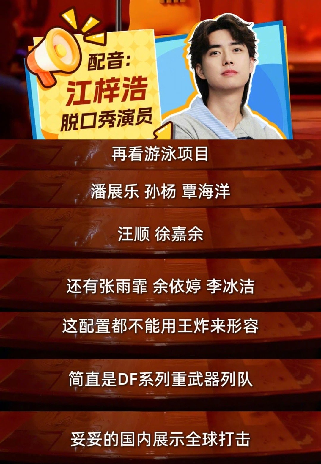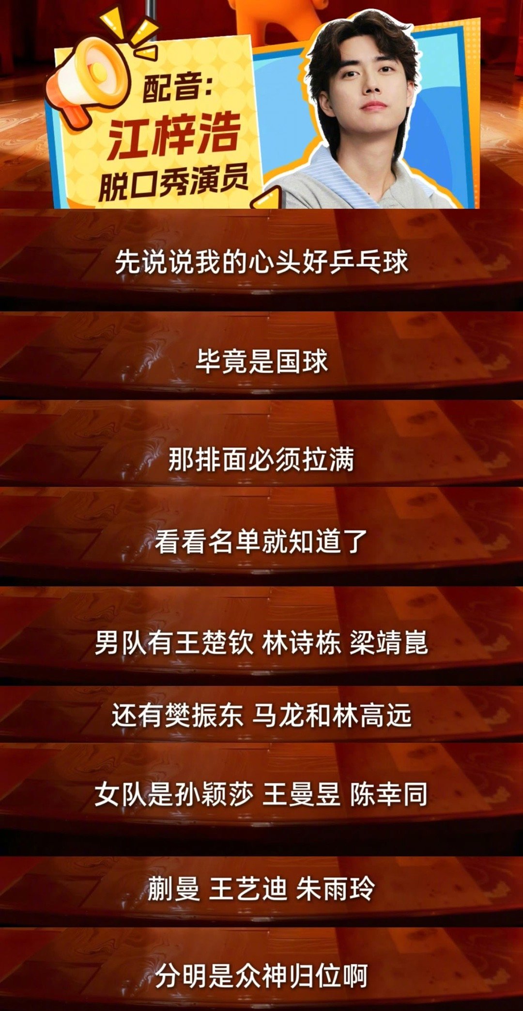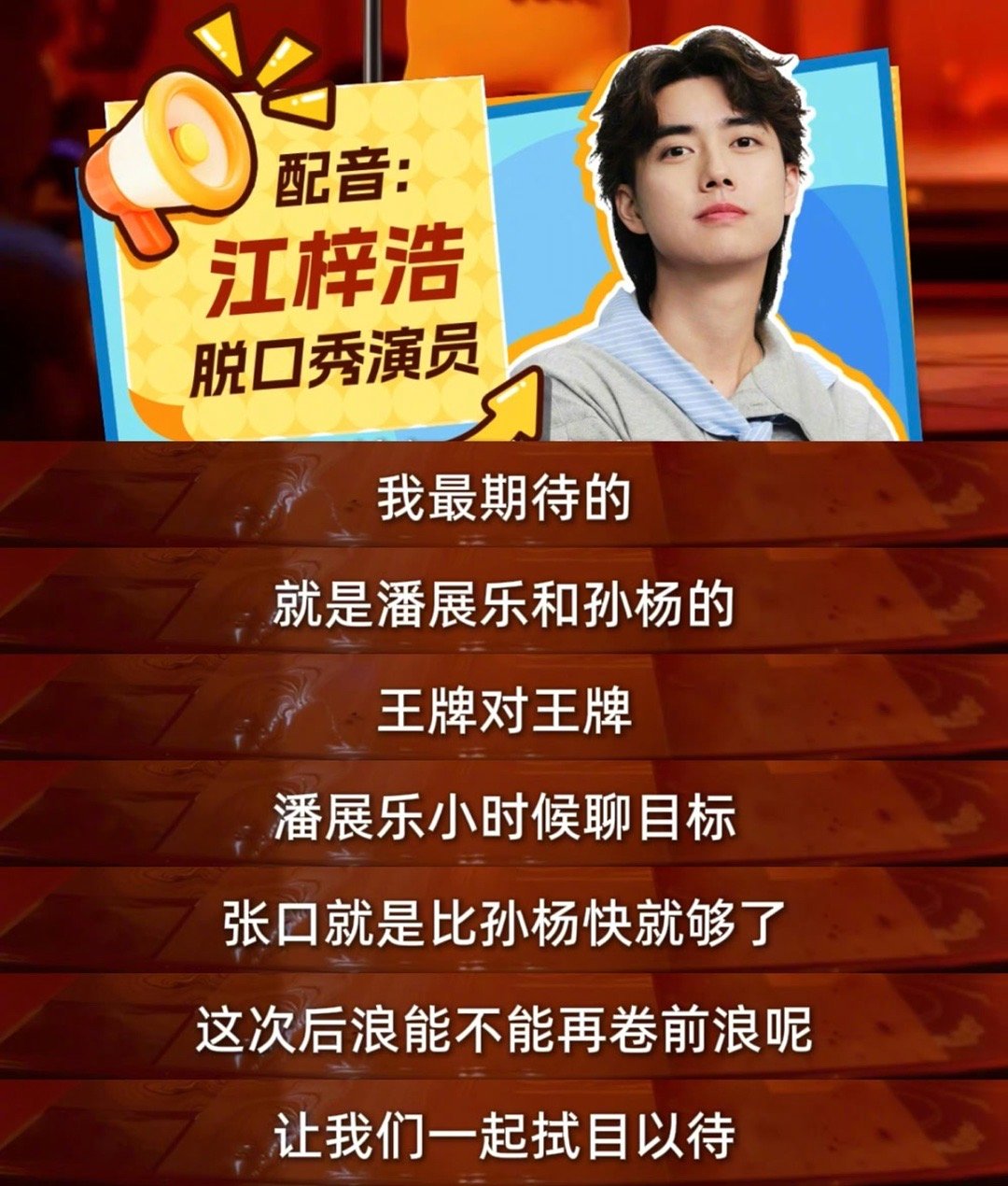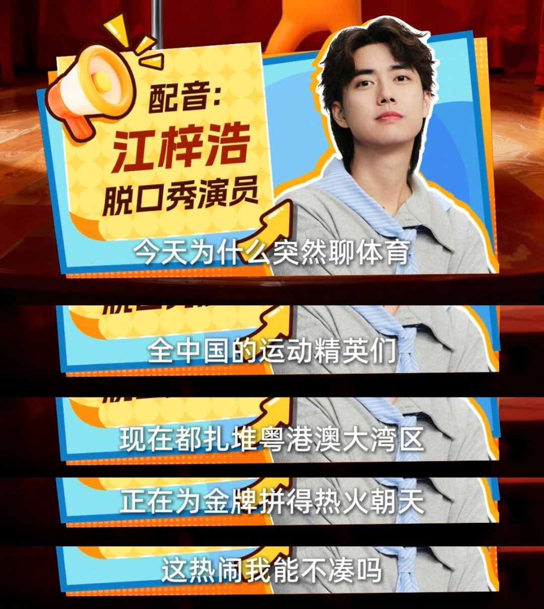 江梓浩脱口秀助阵全运会江梓浩全运会力挺王楚钦 脱口秀跨界体育超惊喜!江梓浩解锁新体验,用趣味段子夸赞粤港澳全运盛况,力挺2025年11个单双打冠军得主王楚钦,祝福与热度齐飞~