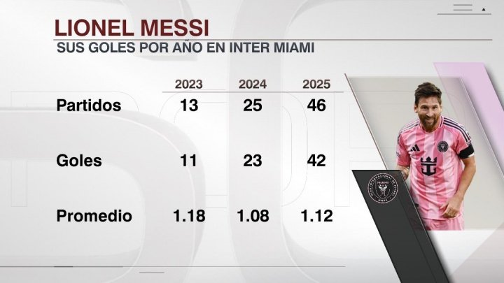 ESPN统计梅西近3年在迈阿密国际进球效率,接近场均1球: