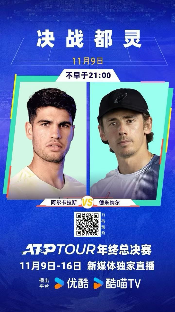 WTA总决赛曲终人散,ATP总决赛无缝连接。年底网球迷周周都能看高端局[嘻嘻]今晚9点起,在解说总决赛康纳斯组首轮:阿尔卡拉斯vs德米纳尔
