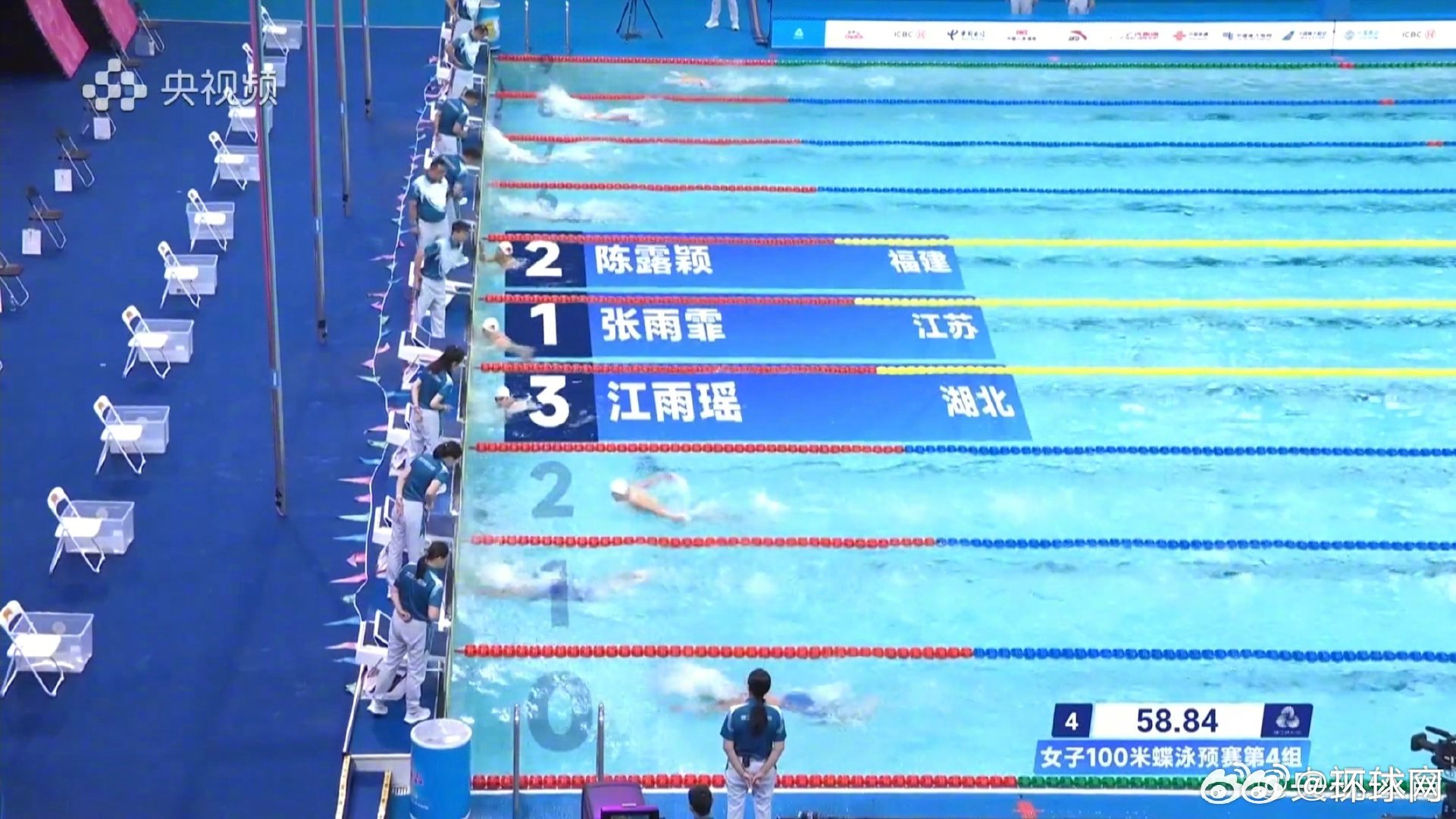 【#张雨霏晋级100米蝶半决赛#】全运会女子100米蝶泳预赛,张雨霏以58秒84排名第四,顺利晋级半决赛。(央视体育)