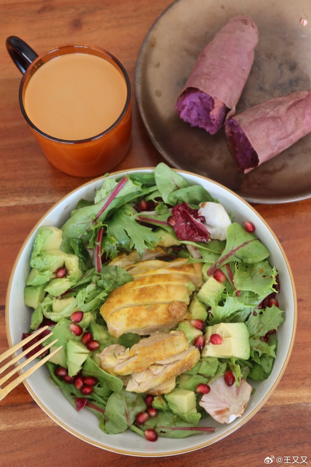午餐:姜黄蒜粉初榨橄榄油烤鸡腿肉牛油果🥑石榴沙拉🥗、烤紫薯、路易波士茶椰奶拿铁。最近烤的温度都设在300F/150C度一下,低温烤,烤没有蒸煮健康,但喜欢吃烤的东西,就低温慢烤,稍好点